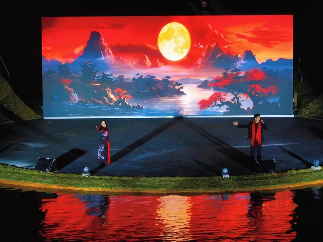 音大草坪水上舞台,歌舞表演轮番上演,营造热烈欢腾的节庆氛围。