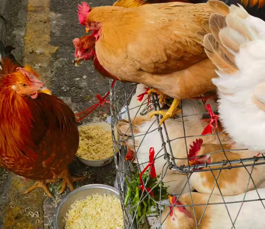 女儿盯着一笼活鸡看了很久,鸡儿们吃的居然是豌豆苗,在北京要十多块一斤呢 👇🏻