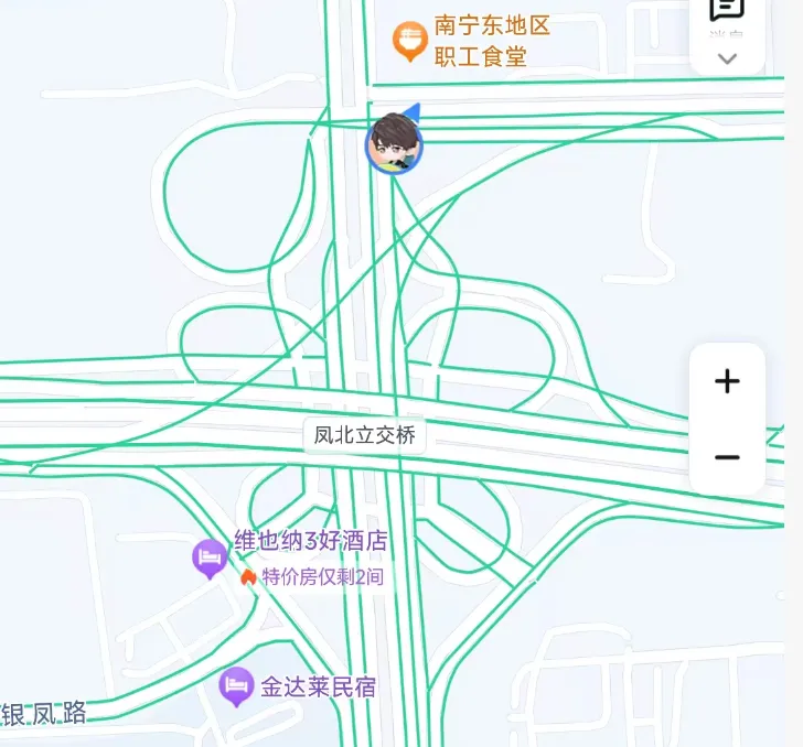 晚上回东站没花钱,朋友B开车送过去。他在南宁待了大半辈子,很自信没看导航,结果在东站立交桥走岔道了。我打开地图,看到这立交桥路线瞬间晕了,决定就近下车走回酒店,也避免让朋友再绕歪路。