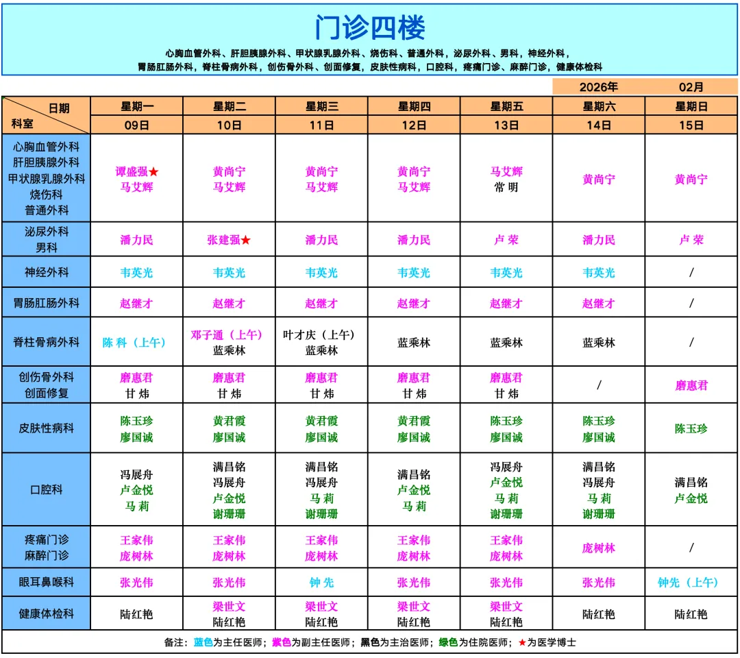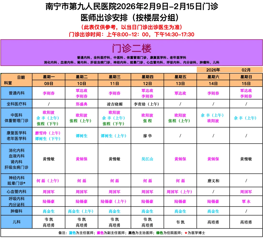 南宁市第九人民医院门诊医师出诊安排来了(2月9日-2月15日)