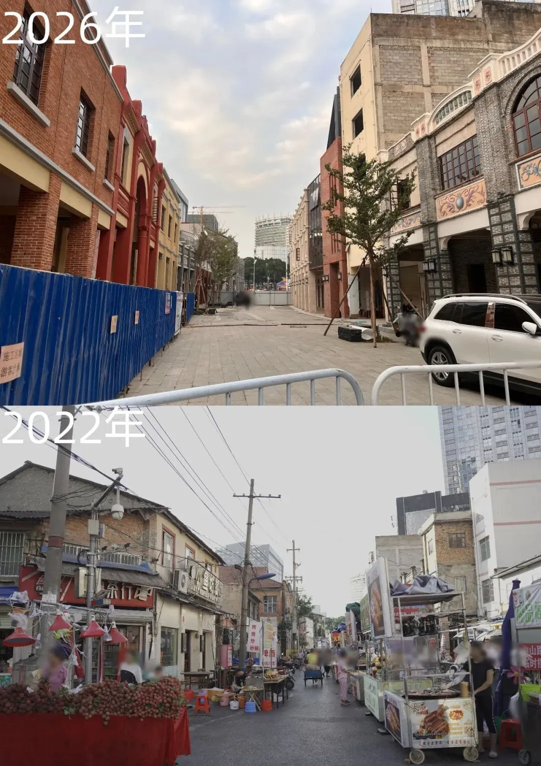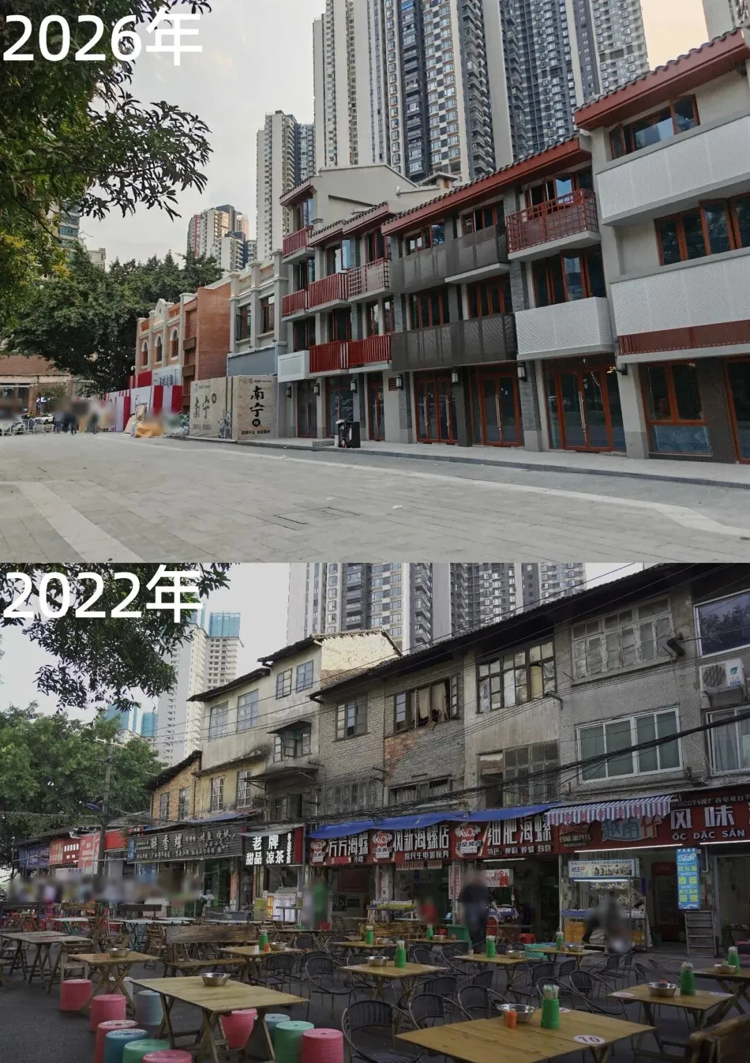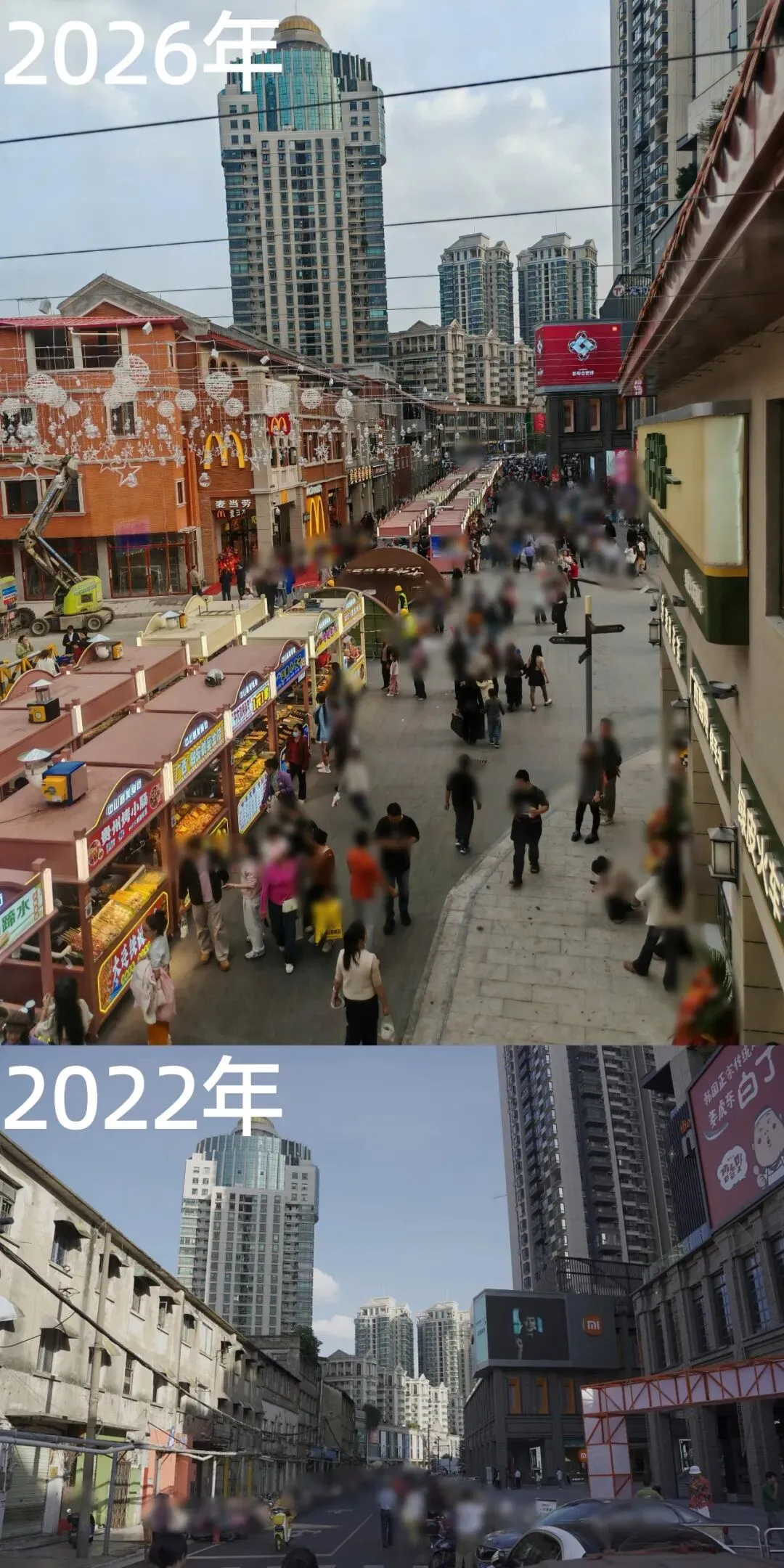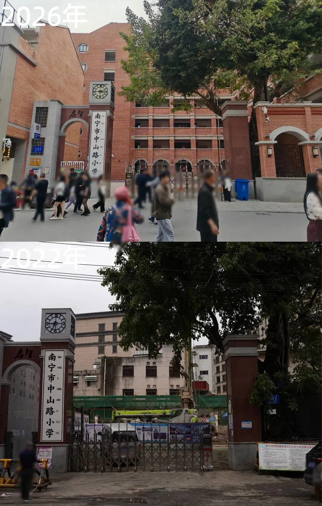 可还有多少人记得它过去的模样?我收集了一些2022年开拆前和2026年改造后的照片,一起看看。以前中山路的门头,是木制的,上面有双龙戏珠。现在的中山路街名旁有“历史文化街区”的字样,身份变了,定位升级。没想到,中山路小学的大门样式变化不大,里面的建筑全部重建。以前的中山路,电线杂乱无章,道路是沥青。现在的中山路干净明亮,完全脱胎换骨。以前共和路靠医院的街道,有一排烧烤店,那时候点几手生蚝,再来一碗海鲜粥好不畅快。但现在新进驻的店家,目前是肯德基。我注意到,有些楼栋可能是私人住宅,不少房东正对外商铺招租。时隔4年,凉茶铺前的大树仍在,但陈老太凉茶又在哪?我依稀记得,拐角处的位置有一家生牛店不错,如今却找不见踪影。共和路靠近丽园天际的街道仍在施工中,以前这里有小型露天菜市。中山路围挡多年等来开街,最开心的莫过于中山路万象汇,总算是熬出头了。它的两侧都是小吃摊位,中山路越热闹,商场客流越多。据了解,前段时间中山路万象汇久违地迎来新店(必胜客)进驻。自此,由水街、中山路、三街两巷组成的邕州古城正式出道,未来可期。诞生至今,中山路其实一直在变,它原本叫“马草街”,商家来来回回。解放前红极一时的铨记杠打猪手面、大众北方大包,耀记芝麻糊等早已消失在历史的长河里。我犹记得开拆前的中山路,老店味道固然好。但这条街常年被油烟“浸泡”,路面都快“包浆”了,总是有股若隐若无的臭味。而且中山路有不少房已是“危房”,居住体验极差,街道“素颜”一言难尽。以前的中山路,白天安静,夜晚热闹,黑夜、华灯掩盖住它的老旧破败,热腾腾的美食香气也冲淡其他杂味。我宁愿看到整齐划一、不太熟悉的中山路,幸好中山路不再是“中山路”。中山路自2022年11月启动改造,至今已近四年。如今重新开街,它能否夺回“南宁第一夜市街”的称号?