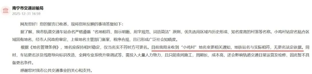 官方回复表示,根据《地名管理条例》,地名应保持相对稳定,仅当名实不符时方可更名。目前南宁市交通运输局未收到“小鸡村”地名变更相关通知,地铁站名与实际相符,无更名法定依据。