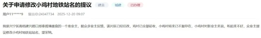 ▲市民建议更改“小鸡村”站名