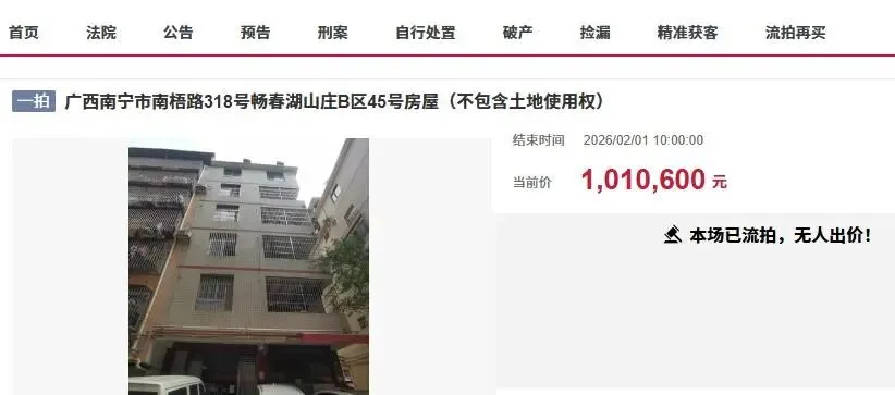 近日,在阿里拍卖上,一栋位于南宁市南梧路318号畅春湖山庄B区45号房屋迎来了首次被拍卖的最后一天竞拍。此次拍卖的是一栋私人自建房,房子本身是相当不错,房子属于联排楼房中的边户,三面光,户型方正,房子建筑面积高达619.65平方米,一共6层,土地使用面积93.5平方米。