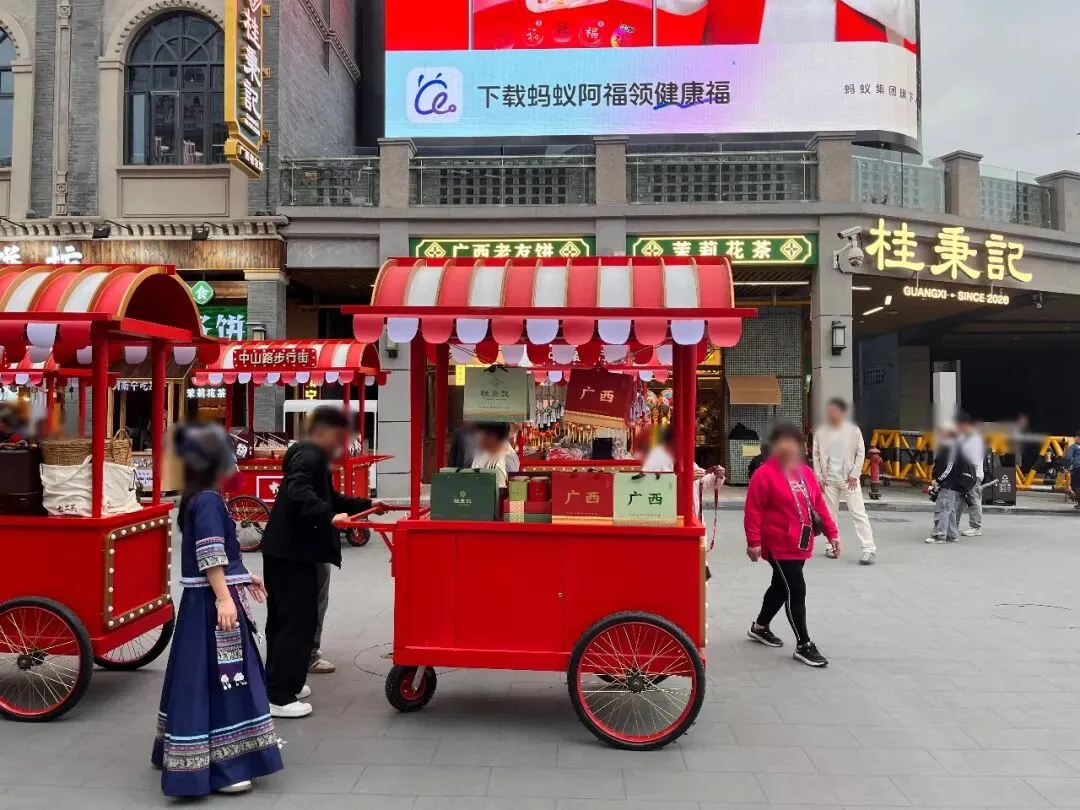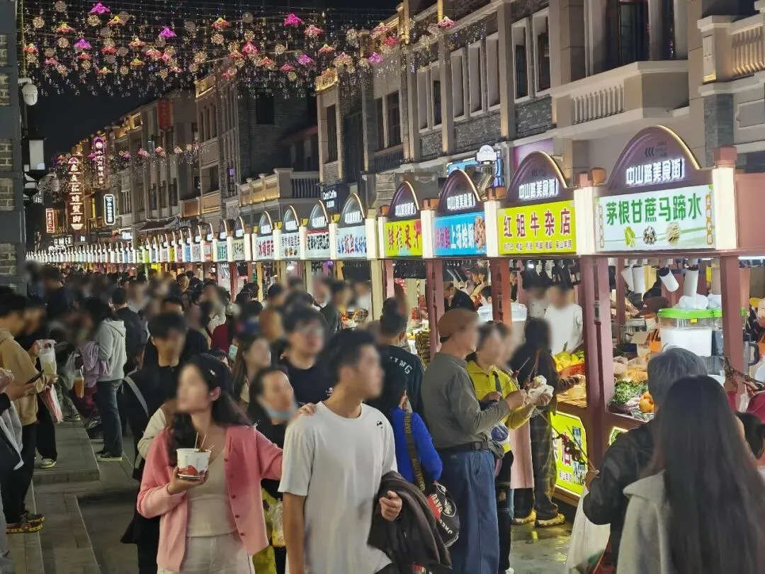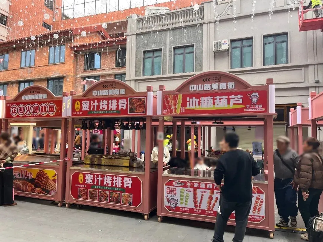 它惊艳亮相的同时,也带来些许疑问:“中山路的老店还在吗?”“围挡多年中山路能否重返顶流?”“原来的沥青道路为何要仿古打造?”实际来看,该保护修缮项目率先投入开放的是北起民族大道、南至南环路的中山路,全长约350米(百度测距),而共和路沿街店面仍在装修冲刺或有待招商。待到华灯初上,来逛中山路的人渐渐多了起来,竟有些摩肩接踵,很热闹。现在小吃摊摆在道路中间,“天然”分开两个通道,沿街门店前面无阻挡。摊位、门店都能享受到畅通流动的客流。固定摊位类似餐车,可遮阳避雨,整齐划一的装潢,颜值清爽,但也不好辨认谁是老店谁是新店,需要仔细回想。小道消息称,中山路大概有200个摊位,统一收银,每个摊位的摊车押金为1万元,营业额按照一定比例抽成(A级区域月销售额≦2万元,21%),非回驻摊主保底租金为5000元/摊/月。②新店多,老店也不少