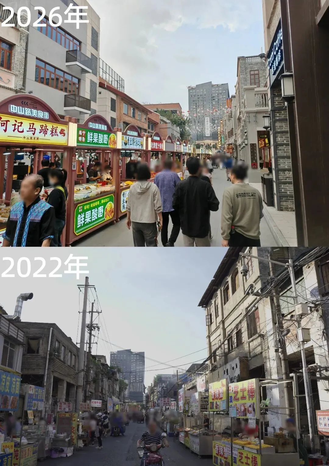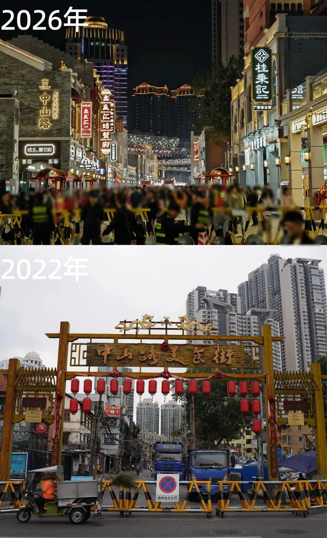 可还有多少人记得它过去的模样?我收集了一些2022年开拆前和2026年改造后的照片,一起看看。以前中山路的门头,是木制的,上面有双龙戏珠。现在的中山路街名旁有“历史文化街区”的字样,身份变了,定位升级。没想到,中山路小学的大门样式变化不大,里面的建筑全部重建。以前的中山路,电线杂乱无章,道路是沥青。现在的中山路干净明亮,完全脱胎换骨。以前共和路靠医院的街道,有一排烧烤店,那时候点几手生蚝,再来一碗海鲜粥好不畅快。但现在新进驻的店家,目前是肯德基。我注意到,有些楼栋可能是私人住宅,不少房东正对外商铺招租。时隔4年,凉茶铺前的大树仍在,但陈老太凉茶又在哪?我依稀记得,拐角处的位置有一家生牛店不错,如今却找不见踪影。共和路靠近丽园天际的街道仍在施工中,以前这里有小型露天菜市。中山路围挡多年等来开街,最开心的莫过于中山路万象汇,总算是熬出头了。它的两侧都是小吃摊位,中山路越热闹,商场客流越多。据了解,前段时间中山路万象汇久违地迎来新店(必胜客)进驻。自此,由水街、中山路、三街两巷组成的邕州古城正式出道,未来可期。诞生至今,中山路其实一直在变,它原本叫“马草街”,商家来来回回。解放前红极一时的铨记杠打猪手面、大众北方大包,耀记芝麻糊等早已消失在历史的长河里。我犹记得开拆前的中山路,老店味道固然好。但这条街常年被油烟“浸泡”,路面都快“包浆”了,总是有股若隐若无的臭味。而且中山路有不少房已是“危房”,居住体验极差,街道“素颜”一言难尽。以前的中山路,白天安静,夜晚热闹,黑夜、华灯掩盖住它的老旧破败,热腾腾的美食香气也冲淡其他杂味。我宁愿看到整齐划一、不太熟悉的中山路,幸好中山路不再是“中山路”。中山路自2022年11月启动改造,至今已近四年。如今重新开街,它能否夺回“南宁第一夜市街”的称号?