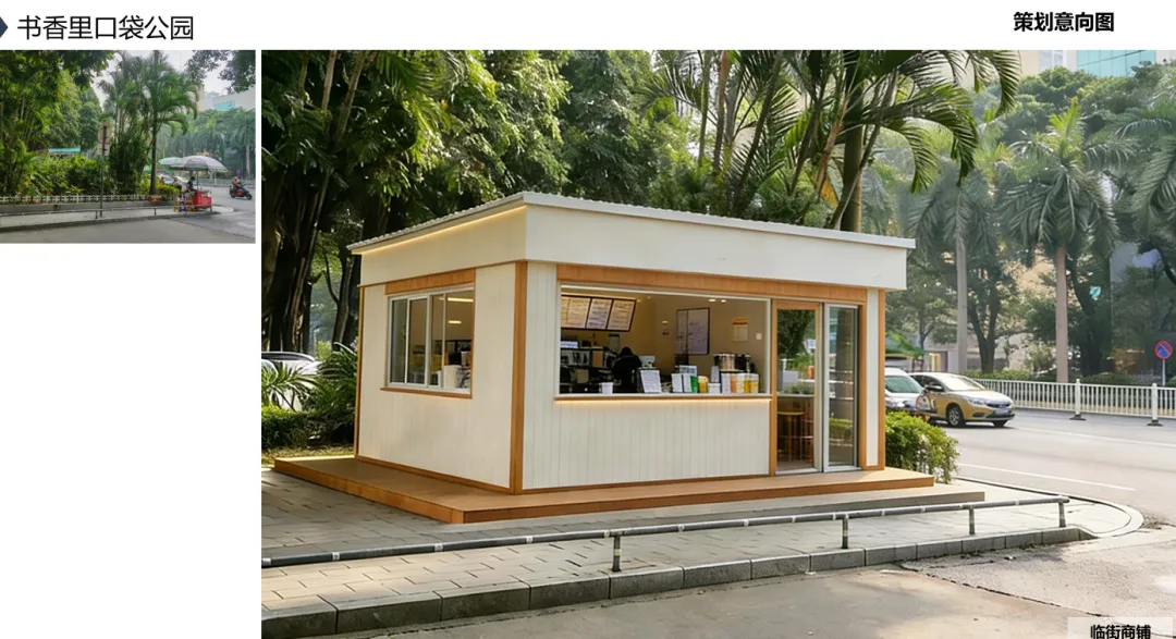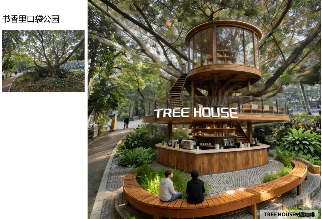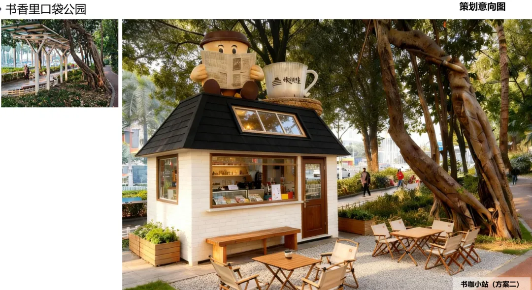 不同于传统公园的大投入、大建设,南宁的小微公共空间改造,走的是 **“轻量化、高适配、重体验”** 的路线,以最小的投入激活空间最大的价值,书香里口袋公园就是最佳范本。这片位于自治区图书馆旁的绿地,原本以纯绿化为主,园路及铺装仅占 9.5%,市民可进入性低、功能单一。此次改造不搞大拆大建,总投资仅 86.48 万元,却精准拿捏了 “图书馆旁” 的区位特质,将 “书香” 基因贯穿始终,实现了从 “单一绿地” 到 “复合空间” 的蜕变,更守住了 **“绿化不缩水、建筑不超规”** 的底线:改造后绿化用地仍达 1443㎡,占比 70.3%,建筑占地不足 1%,所有经营性建筑均为临时搭建,不占用建筑指标,完美契合园林绿化工程的用地规范。整个改造的巧思,藏在每一个细节的精准设计里。在 2053㎡的空间里,设计师划分出可经营性空间、轻量化改造空间、景观配套空间三大板块,每一分预算都花在刀刃上:105.6㎡的可经营性空间,打造树屋服务站、文创零售店、书咖零售店三大核心场景,既为市民提供便民服务,也通过轻资产运营实现空间自我造血;460㎡的轻量化改造空间,通过木平台、碎石场地、铺装场地的微改造,扩容市民活动区域,园路及铺装占比提升至 29.7%,兼顾通行与休闲;剩余空间则搭配网红打卡小品、故事墙、景观树池等配套,让颜值与体验双在线。更值得一提的是,此次改造深度绑定 **“图书馆” 周边属性 **,拒绝千篇一律的网红化设计。树屋服务站依托现状大乔木搭建,未来将联动图书馆举办主题读书分享活动,成为林下阅读的新阵地;文创零售店聚焦图书馆文创衍生品展示,实现文化场景的延伸;就连打卡点也设计成 “我在区图很想你” 的主题,与周边文化氛围高度契合。这种 “因地制宜” 的改造思路,让小微空间不再是孤立的休闲点,而是与周边业态、文化深度融合的有机整体。从 “绿化空间” 到 “民生场景”,小微公共空间的多维价值升级