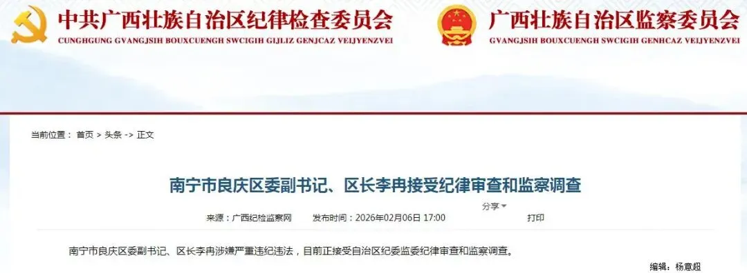 南宁市良庆区委副书记、区长李冉涉嫌严重违纪违法,目前正接受自治区纪委监委纪律审查和监察调查。
