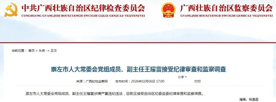 崇左市人大常委会党组成员、副主任王耀雷涉嫌严重违纪违法,目前正接受自治区纪委监委纪律审查和监察调查。