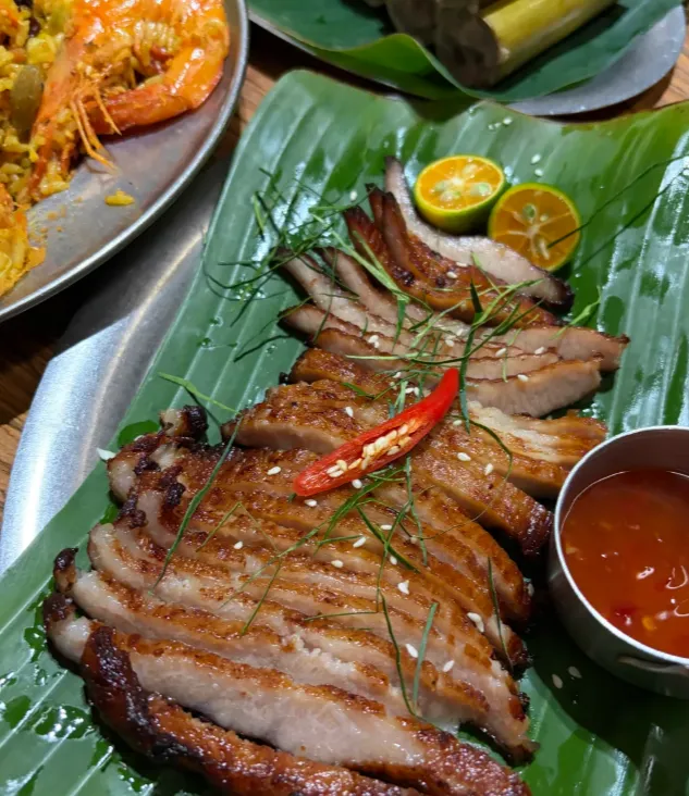 拿一道“壮家烤猪”来说:先把整只仔猪腌上盐、南姜、香料粉,挂在火上不急不慢地烤,靠的是耐心。皮子鼓起泡时,用竹签一扎,油“啪”地落下,香气瞬间就满了。手一抹油,人生也不急了。