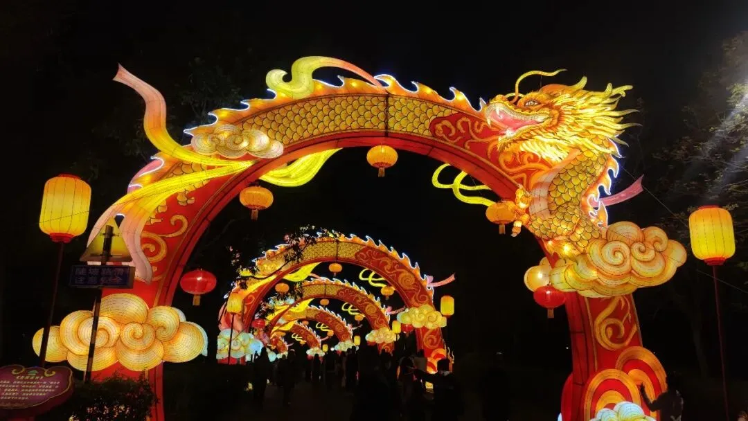 ▲巨龙盘旋,非常震撼。穿过龙廊,“龙驾祥云送福来”,年味十足。