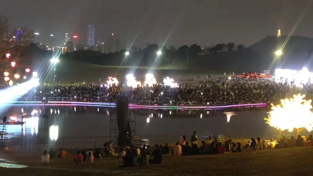 许多人早早就来音乐大草坪占位,观赏歌舞表演,以及打铁花。