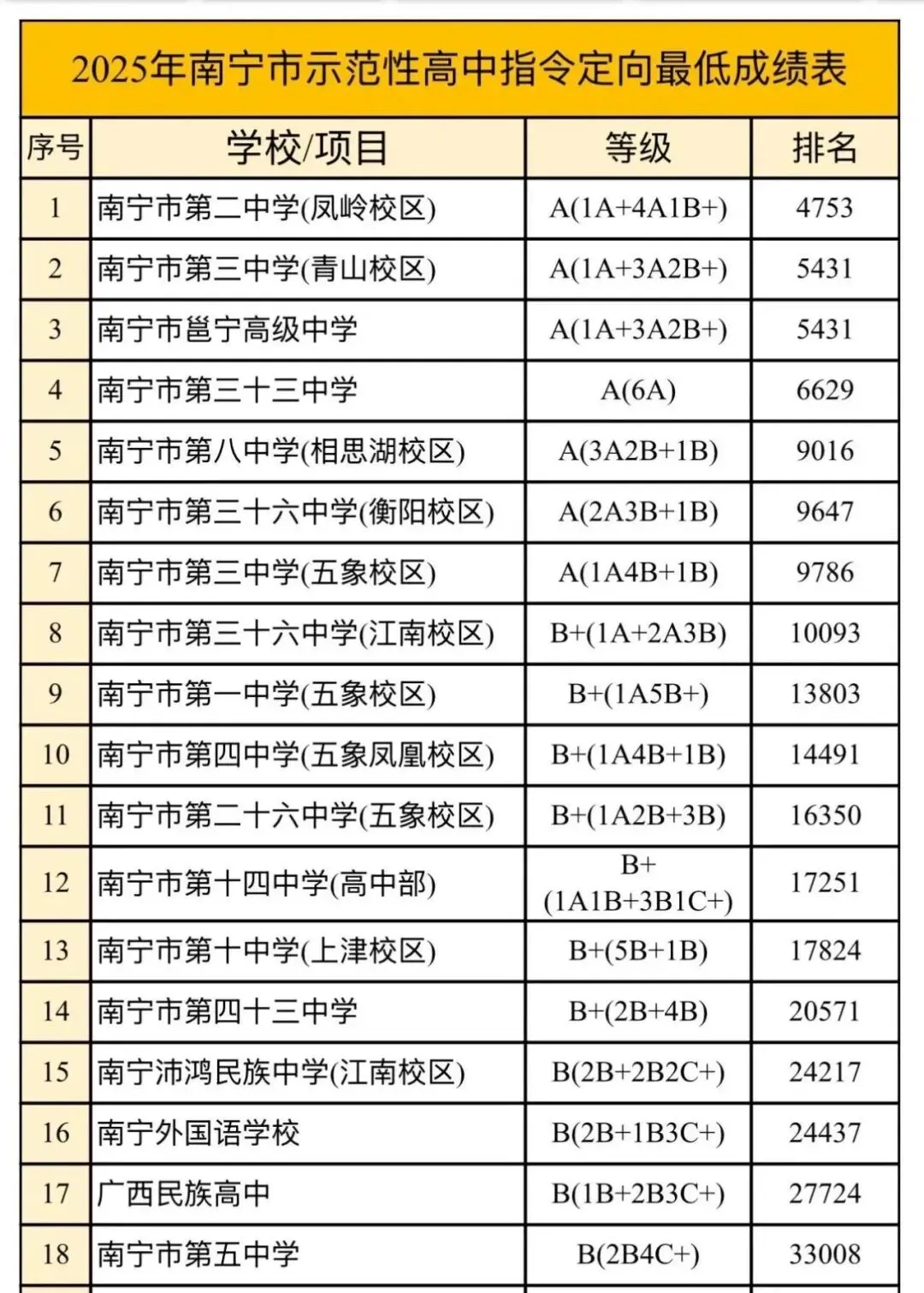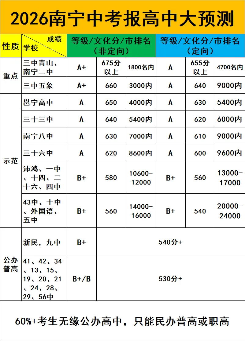 指令非定向、指令定向、指导计划是什么意思?又怎么录取?林老师给家长们一文说清!家长记得转发!第一大类:指令计划。意味着该计划只属于南宁市户籍考生。指令计划又细分为:非定向和定向。非定向意味着该计划只要有南宁户口(包含择校生、地段生)就有资格参与竞争录取。定向则要求考生必须是地段生,才有资格参与竞争录取。第二大类:指导计划。也叫高中学校自定义计划,该计划不限户籍、不限择校或地段,只要在南宁市区参加中考,就能参与竞争录取!举个例子:南宁中考招生信息网报名系统有8000人报了南宁二中,但南宁二中今年只招生1500人,这1500个名额将会划分为三类且按这个顺序录满为止:1.指令非定向675人:只要有南宁市户口考生、无论择校还是地段生,按排名从高到低录取前675名;2.指令定向计划675人:未在非定向被录取、且与本校地段生竞争拿到定向名额资格的地段生,按排名从高到低录取前675名。(各初中分到的定向指标名额见文末、先与本校地段生竞争获得定向资格、再与报了同一所高中的学生竞争录取,全程系统自动完成录取)3.指导计划150人:未在指令非定向、指令定向环节被录取的南宁户口考生、以及非南宁户口借读生(须在南宁市区就读且中考),按排名从高到低录取前150名。南宁市公办示范性高中给到地段初中定向招生指标名额!每年变化不大,具有非常高参考价值,以下为2025年数据,快来看您家孩子初中分到多少!第1步: