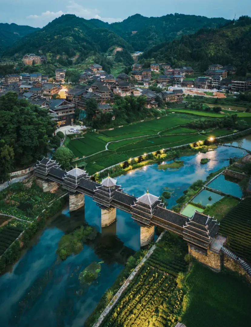 程阳风雨桥最有名,清末民初的老桥,杉木穿斗,不用一颗钉,桥上能走,桥下能戏水,鼓楼一响,侗歌一合,脚步就慢了。