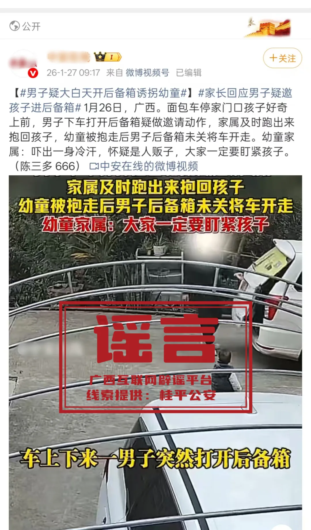 辟谣 | 网传“桂平一男子疑打开汽车后备箱诱拐儿童”信息不实!