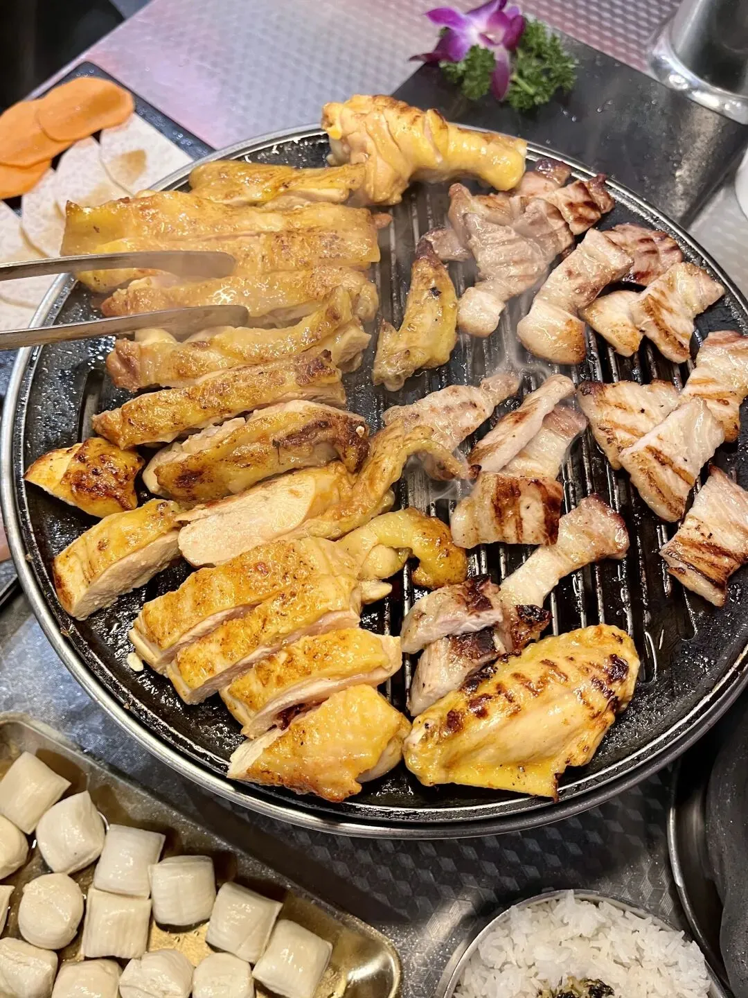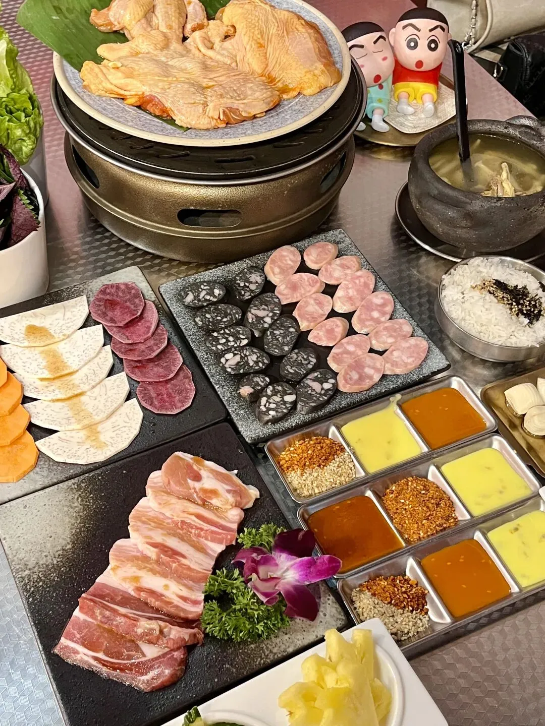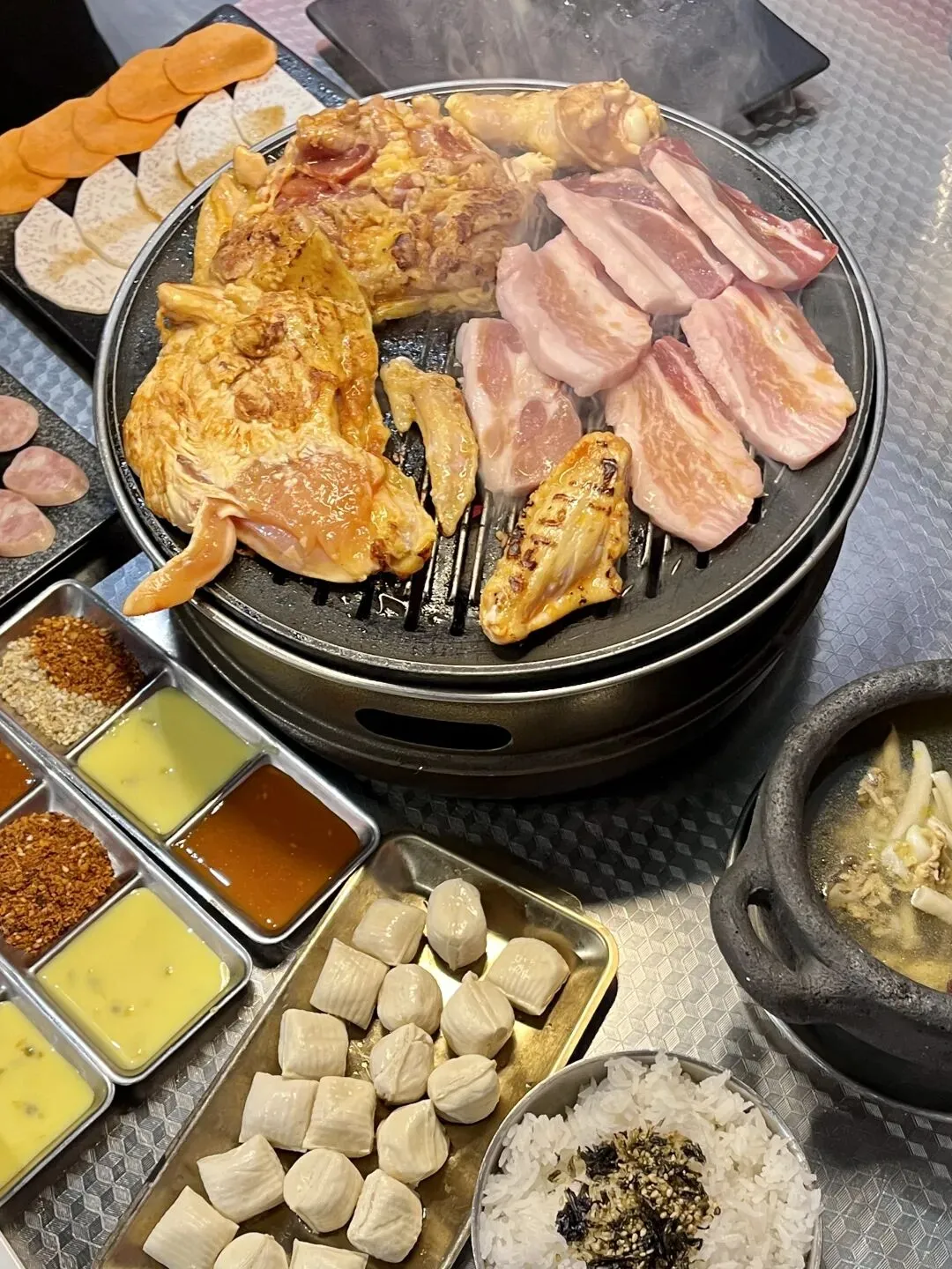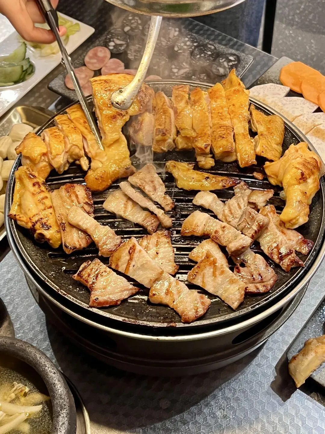 吃肉之余,杂薯三拼和爆浆豆腐为这顿饭添了一份温润的素雅。杂粮的香气与豆腐的细腻,在口中交织成另一种满足。而那一碟碟的开胃小菜——海带丝、酸萝卜、凉拌云耳、泡菜、青瓜、蒜片辣椒圈——酸辣爽口,正好化解了烤肉的丰盈油脂。