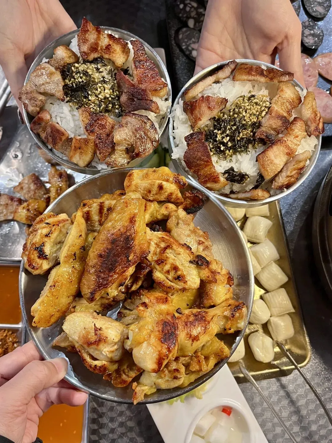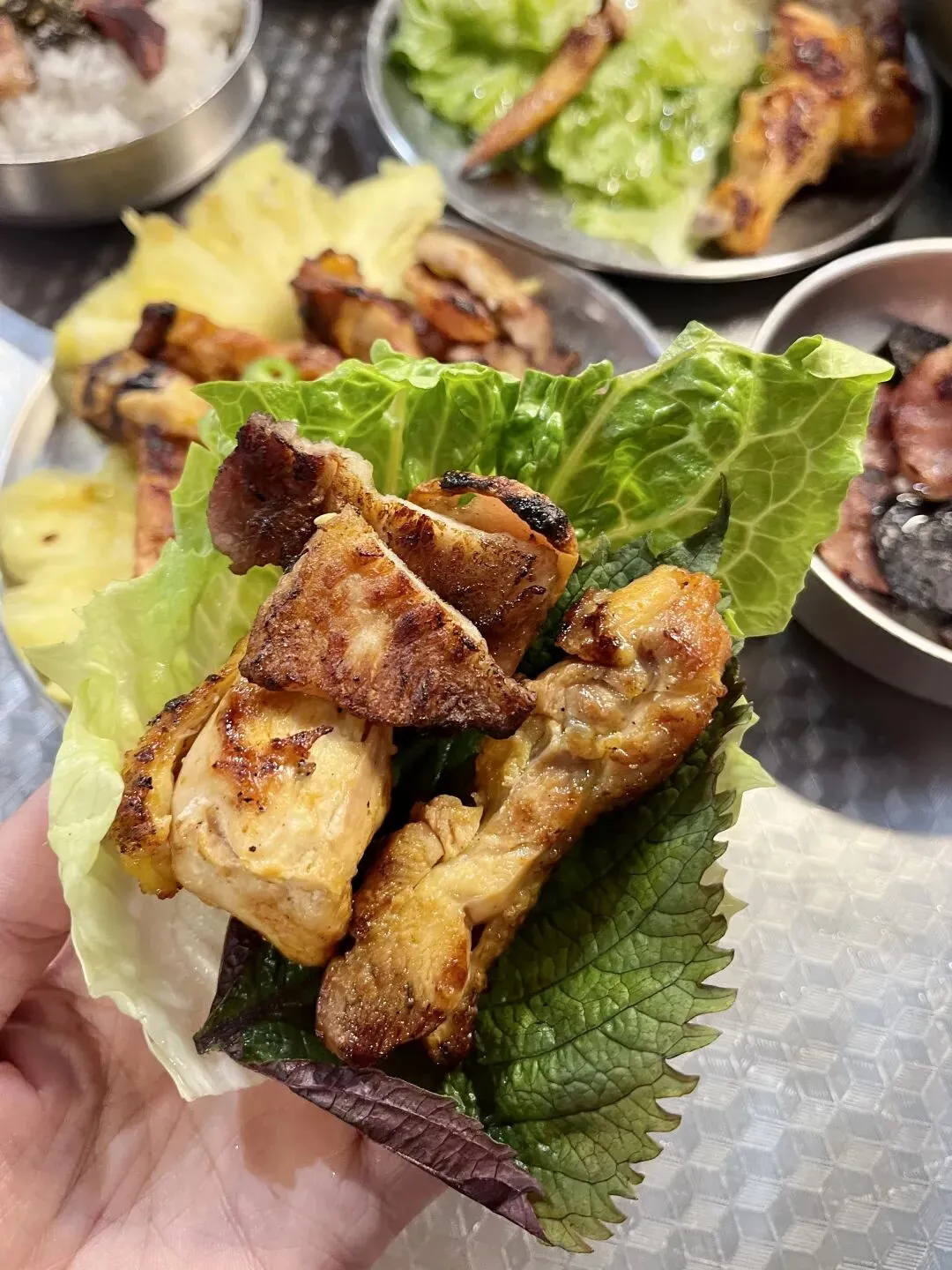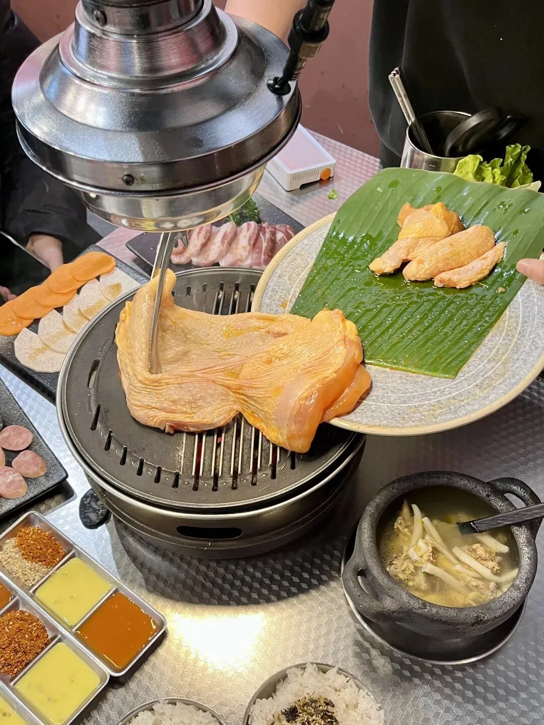 推门而入,暖意扑面而来,炭火的光映在脸庞,像老友的笑。第一道让人惊艳的,是黄油鸡。鸡肉提前腌制得恰到好处,现烤之下,外皮焦香酥脆,内里却依旧保持着鲜嫩多汁。夹起一块,包进清脆的生菜叶,再轻轻蘸一点酱料,入口的瞬间仿佛冬日的阴霾都被融化。