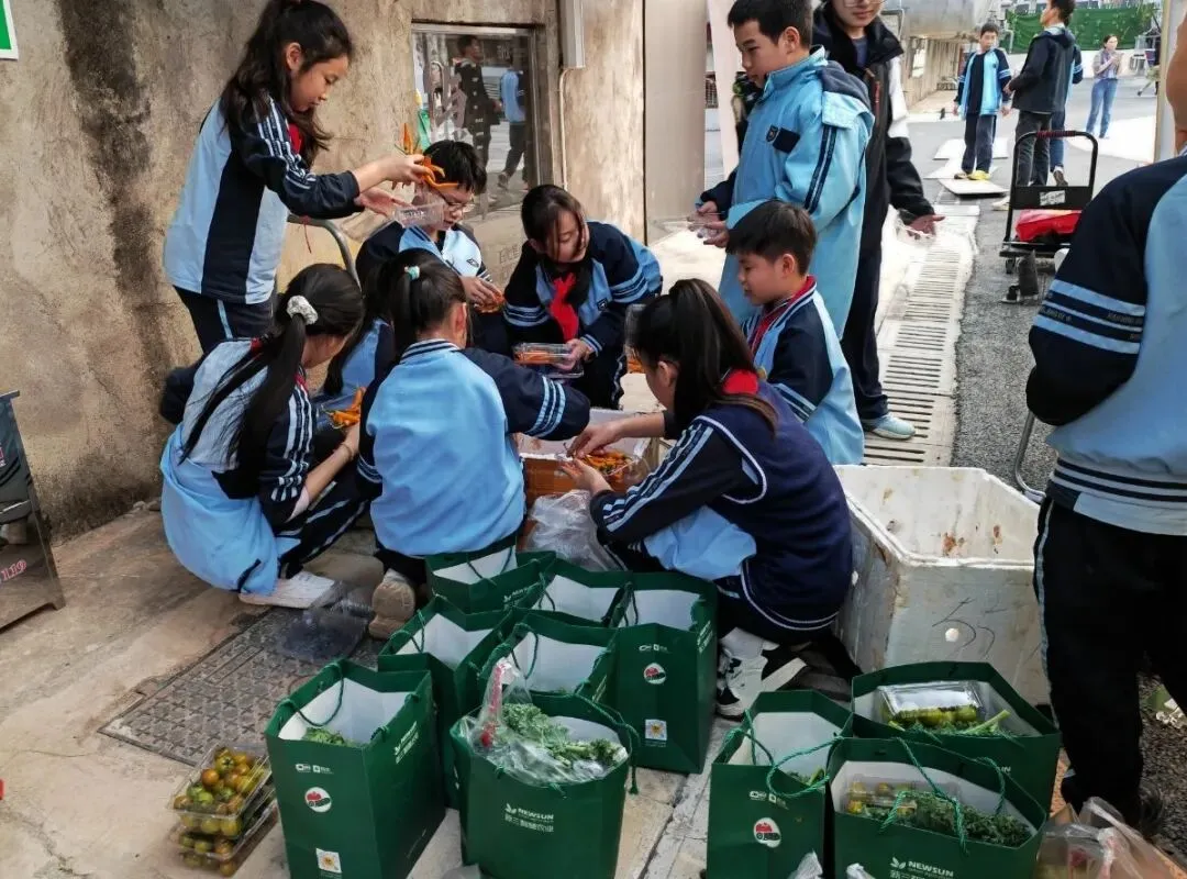 夜幕降临,石化里美好生活街区的公益展销活动温情上线,同学们化身“公益摊主”,开启了一场爱心实践。大家将白天从基地采摘的优质果蔬精心包装、合理定价,组成运营小组,分工负责推销、记账、打包。“叔叔阿姨,买点蔬菜吧,我们的果蔬都是原生态种植的,所得收入将用于公益帮扶哦!”小学生们用稚嫩的声音吆喝着,格外引人注目;初中生们发挥沟通优势,主动向过往市民介绍公益活动的意义;大学生们则凭借专业优势,巧妙设计推销话术,带动展销热度持续攀升。