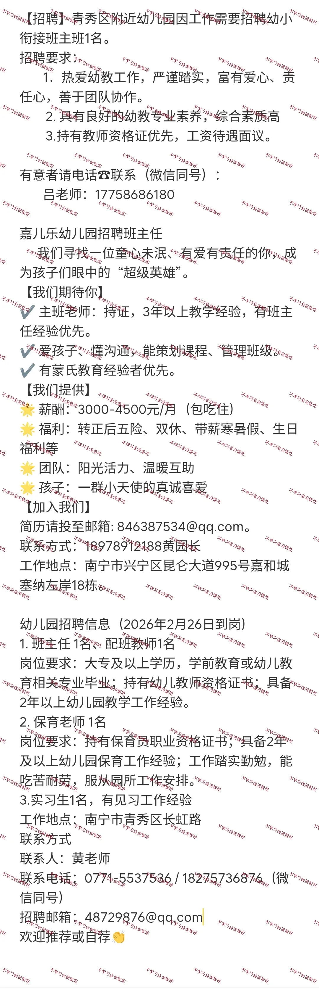 南宁教师招聘:南宁市三所民办幼儿园招聘