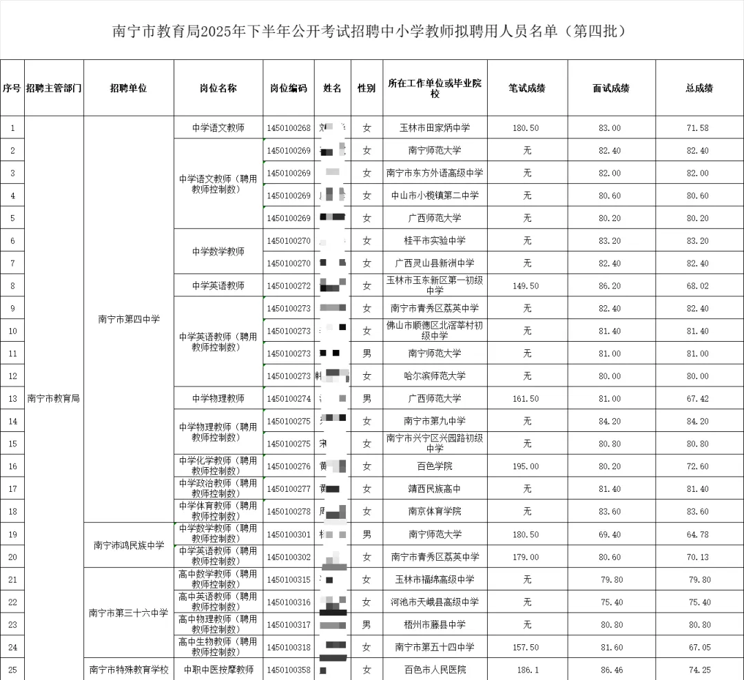 南宁市教育局2025年下半年公开考试招聘中小学教师拟聘用人员公示 (第四批)