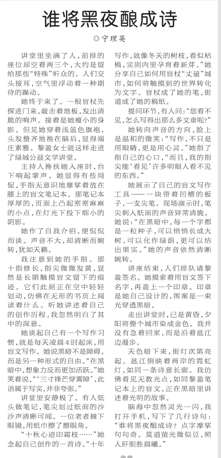 脑海中忽然灵光一闪,我打开手机,写下了几行诗句:“谁将黑夜酿成诗?点字摩挲句句奇。莫道萤光微似豆,照人肝胆胜晨曦。”