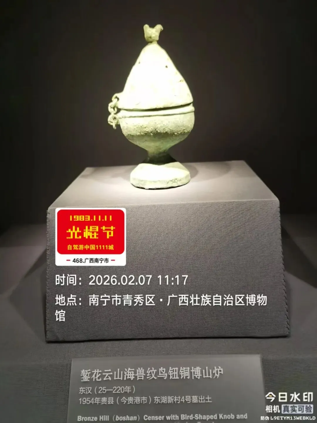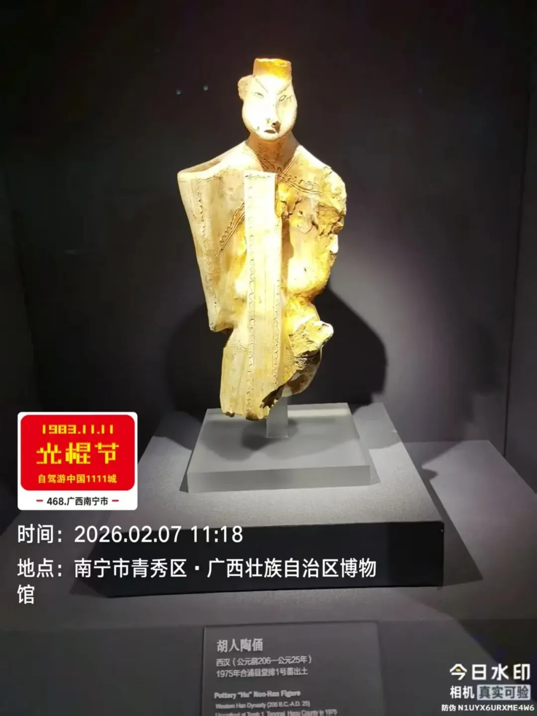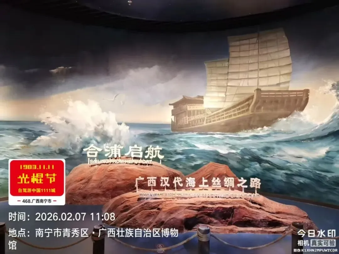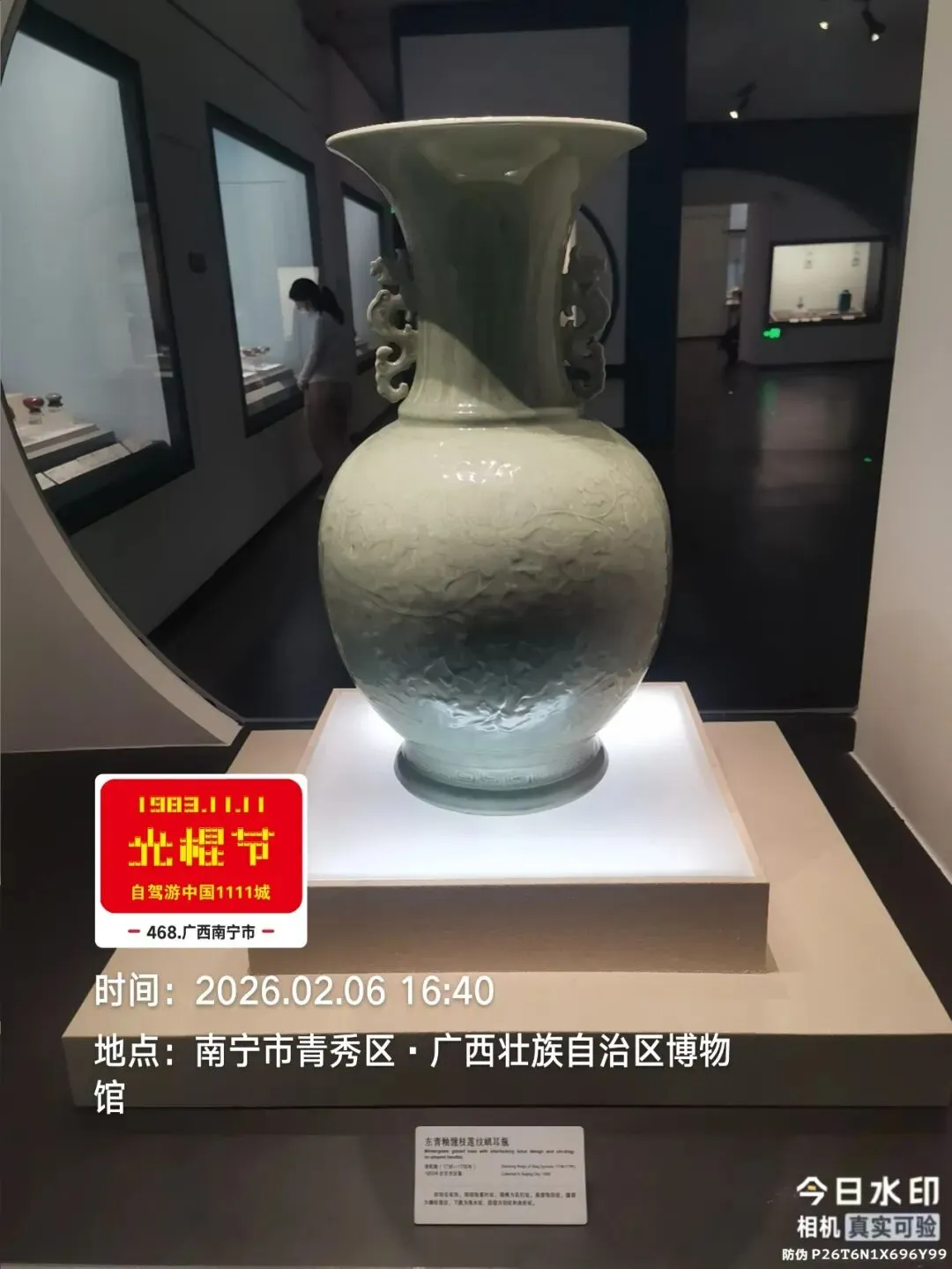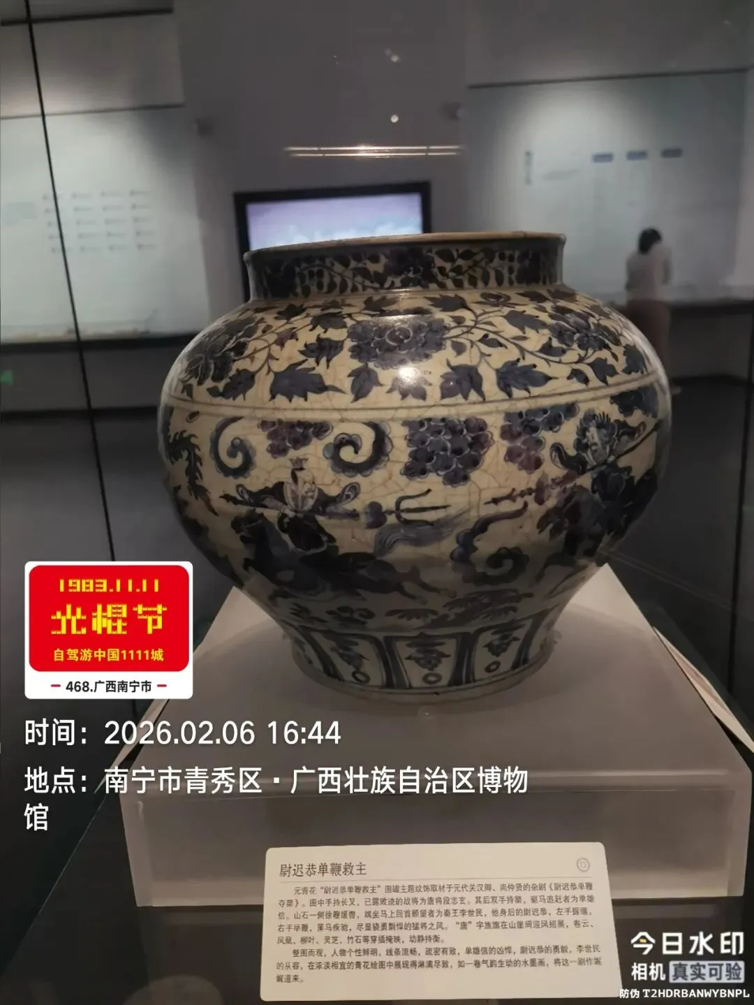 昨天下午来到广西壮族自治区博物馆的时候,发现旁边是个公园,而且景色不错,就在里面转了转,拍了几张照片。这件“元青花”是从横州市博物馆里调上来的,虽然在那里我没有看到真品,但在广西壮族自治区自治区博物馆里,我终于看到了它的“真面目”。这件西汉“翔鹭纹铜鼓”,1976年出土于贵县(今贵港市)罗泊湾1号墓。是广西壮族自治区博物馆的镇馆之宝。“合浦启航——广西汉代海上丝绸之路”。