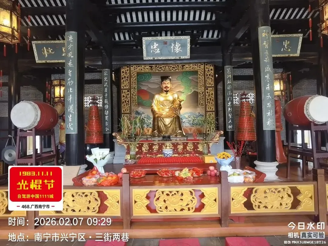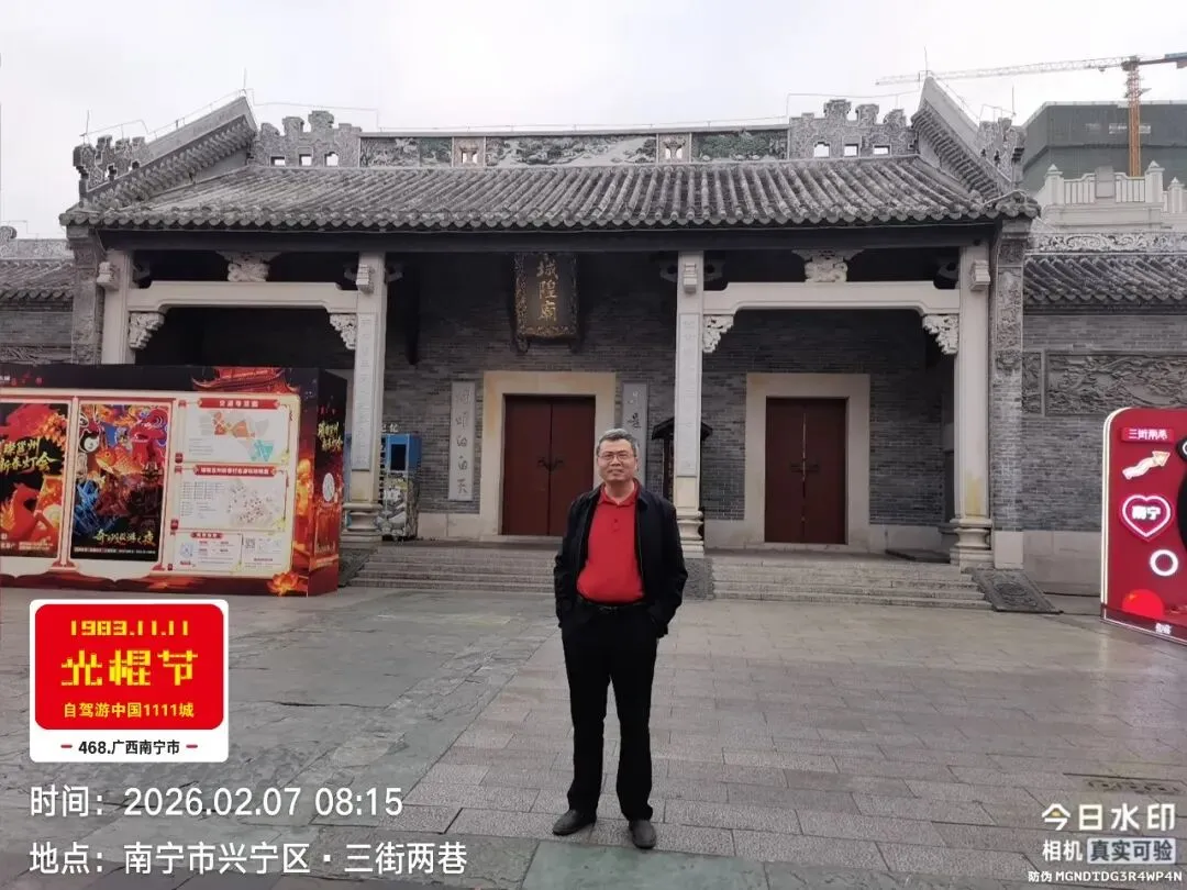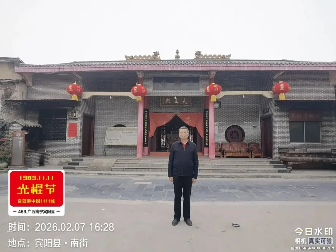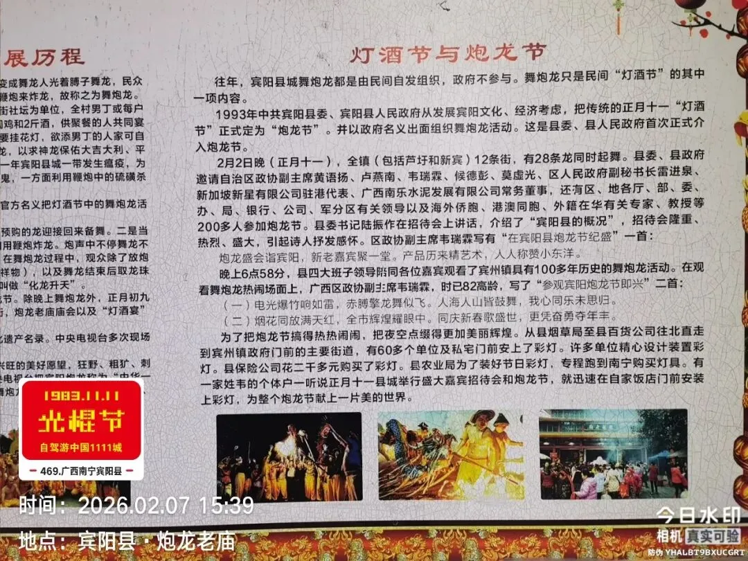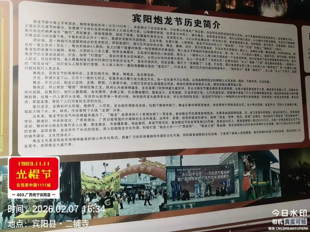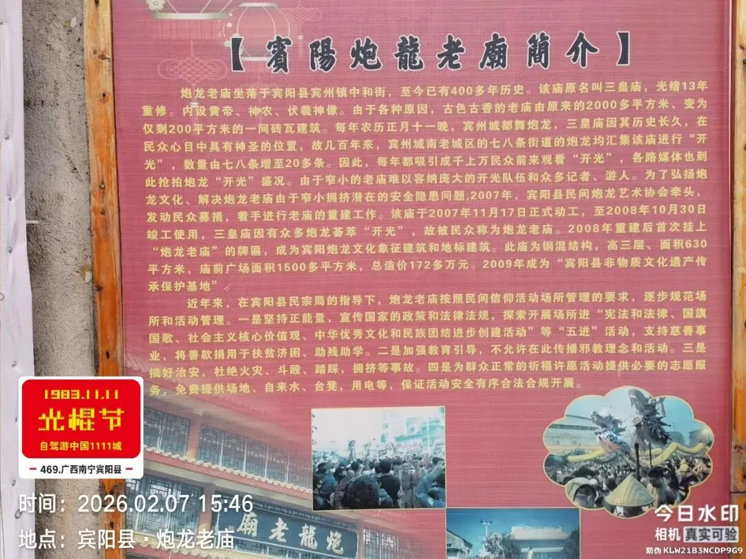 宾阳县地名源于唐贞观五年(631年)所置宾州,因境内宾水得名。民国元年(1912年),宾州改称宾阳县,取县治位于宾水之北(水之北为阳)之意,名称沿用至今。到了宾阳才知道这里有个“炮龙节”。每年农历正月十一晚,宾州城都舞炮龙。这个舞炮龙怎么个玩法,大家还是看图片中的文字介绍吧。在网上搜索“宾州古城”,结果导航把我们引到“南街”来了。南街上除了有一个“二铺寺(天王殿)”之外,就是少数几家开门营业的商铺了。街道上显得非常冷清和萧条。宾阳县炮龙文化广场上,十多个工人正在搭架子,他们正在为今年的炮龙节做准备工作。2026.2.7写于南宁市上林县大利商务酒店202房