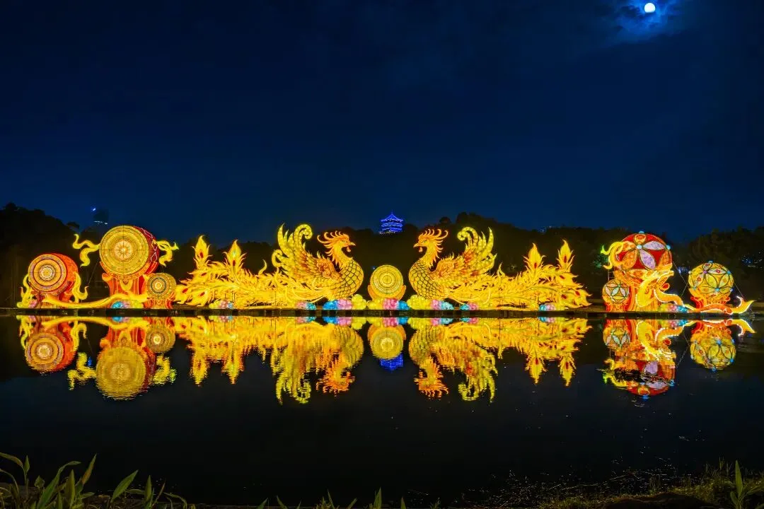 鎏金幻彩的凤凰,携壮乡铜鼓与绣球和鸣而舞。光影倒映水中,虚实交织,演绎一曲锦绣山河的祥瑞诗篇。