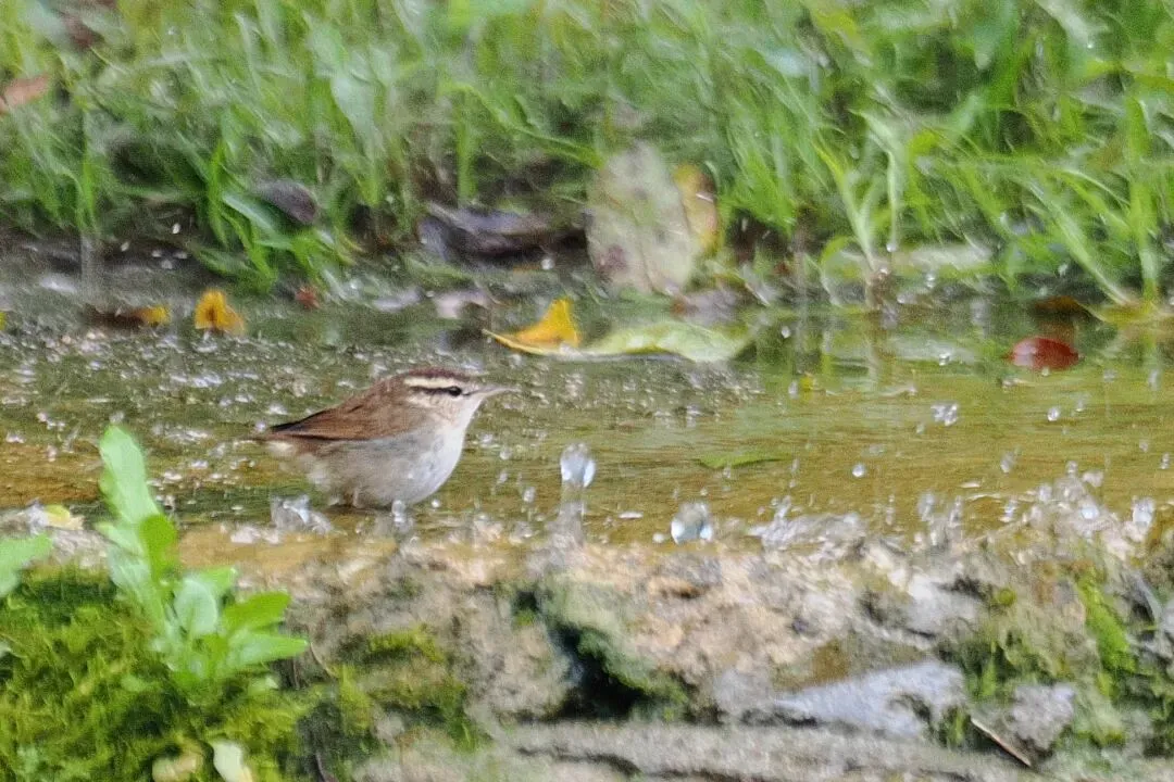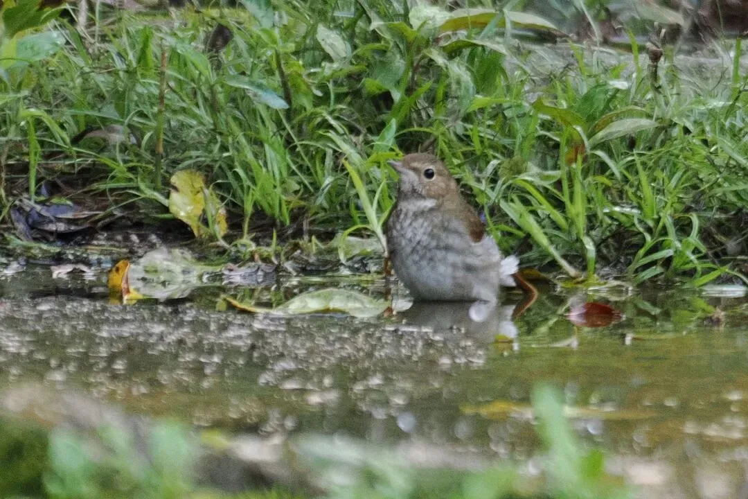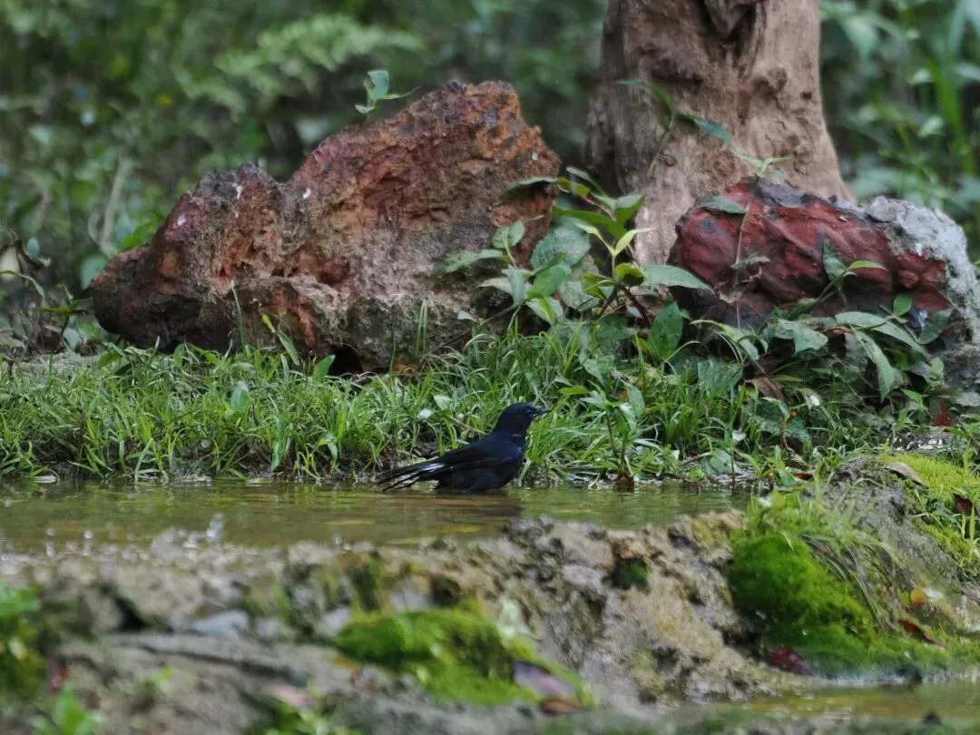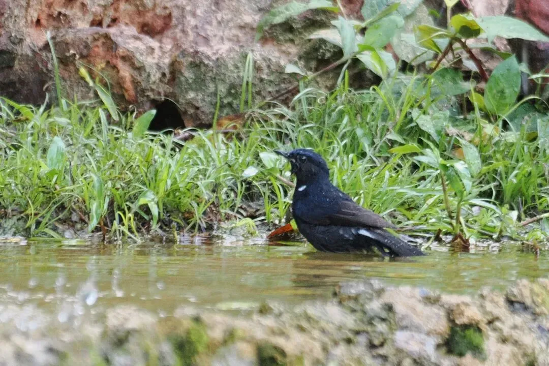 看完蜂虎,又来到了野塘。这次不同的是,水塘来客是一只机警的白尾蓝地鸲,个头很大,整体成蓝黑色,飞行或洗澡时尾羽张开闪现白斑。有个女生说它好黑,有点像大号的鹊鸲,我也觉得在大体上有些相像。它一会儿悄然而至,在水塘里抖动几下羽毛,一会儿没入阴暗的草丛,来去匆匆。这是一种习性隐秘,多在灌丛底层活动的中型林鸟,主要栖息在海拔3000米以下阴暗潮湿的山地常绿阔叶林、混交林的林下灌丛中,主要以昆虫为食。