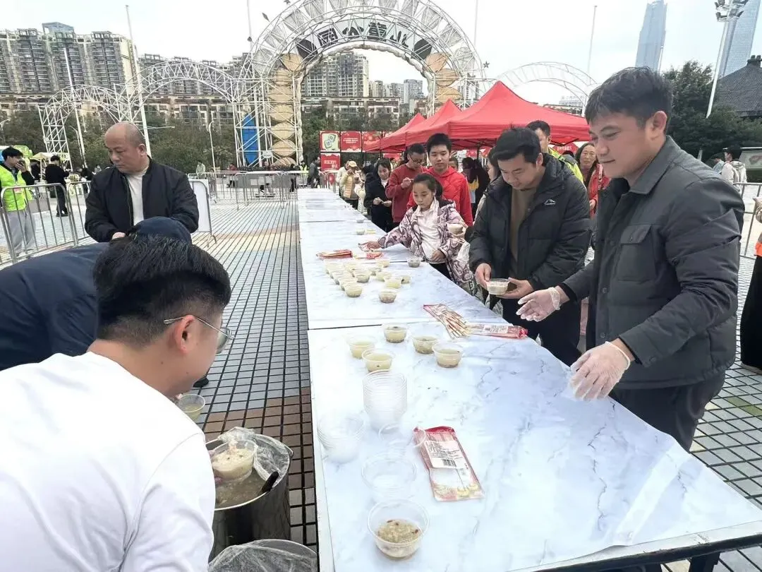 公园广场上,长条宴席整齐排布,宴席香气扑鼻、欢声笑语,市民游客于动漫产业园里围坐一堂。一边大快朵颐品尝特色美味,一边沉浸式感受动漫氛围与团圆暖意,身旁是熟悉的亲友,眼前是地道的桂味,耳畔是喜庆的锣鼓与欢声笑语,彰显了马年“团圆美满、丰衣足食”的美好寓意。