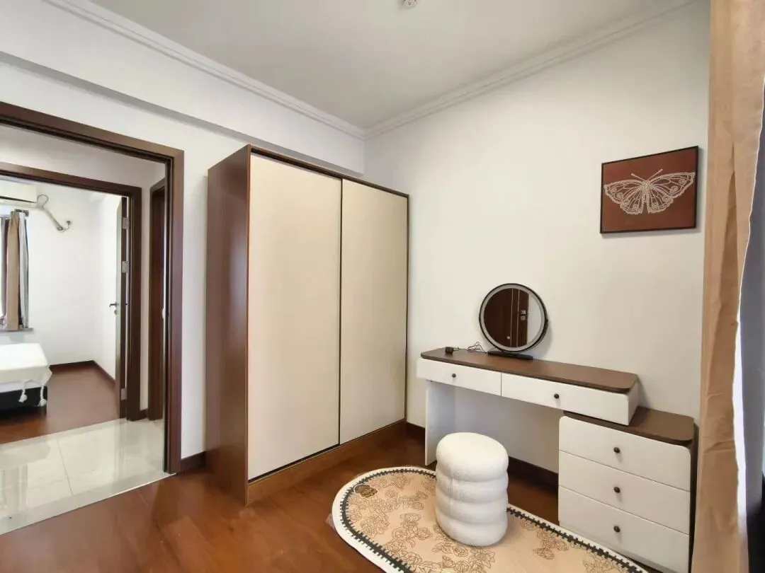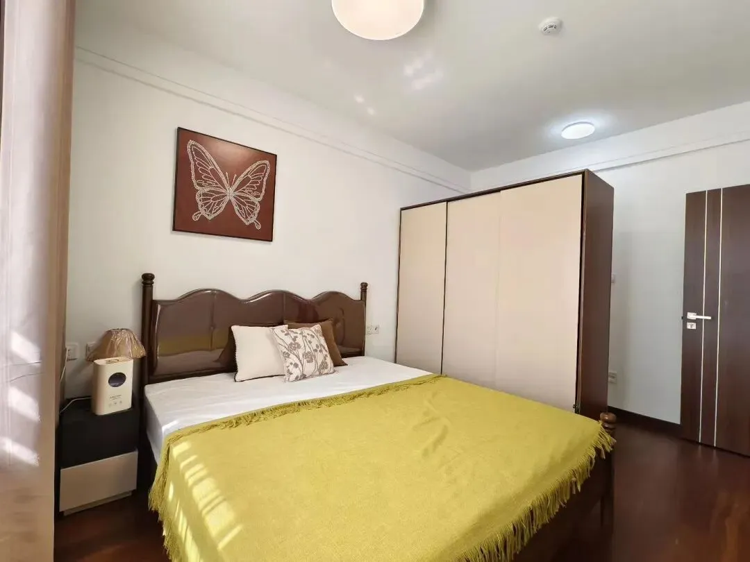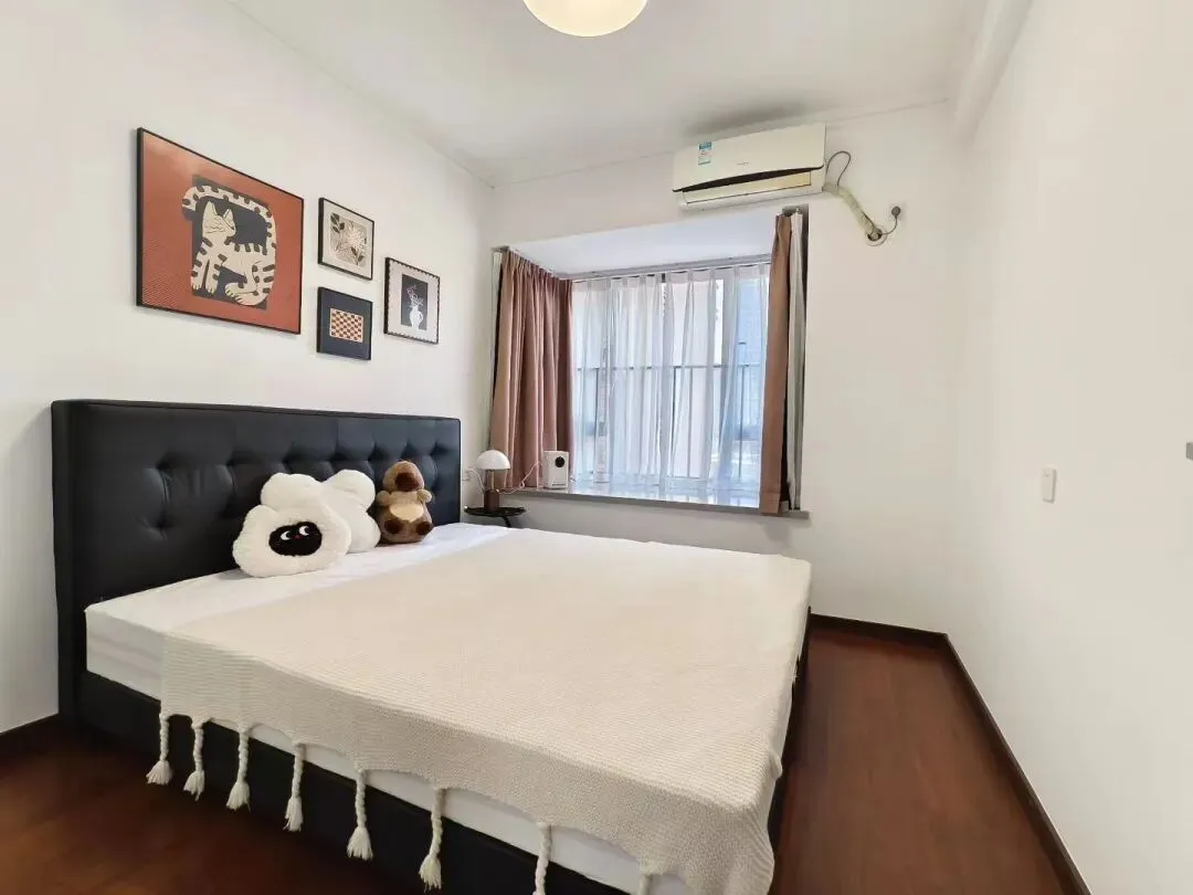 • 极简挂画+干花:两幅小尺寸装饰画留白墙面,搭配白色花瓶里的焦糖色干花,不堆砌元素却处处是细节。