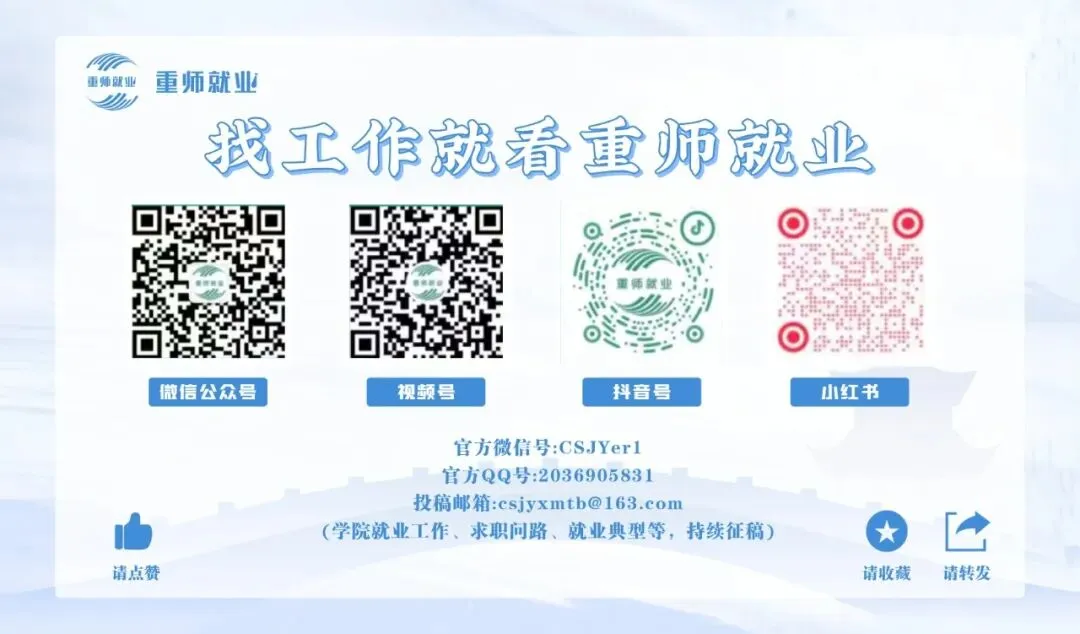 免责声明:重师就业微信公众号系信息发布平台,仅提供信息存储空间服务,本平台相关内容由用人单位提供,如涉及侵权,请联系我们删除。