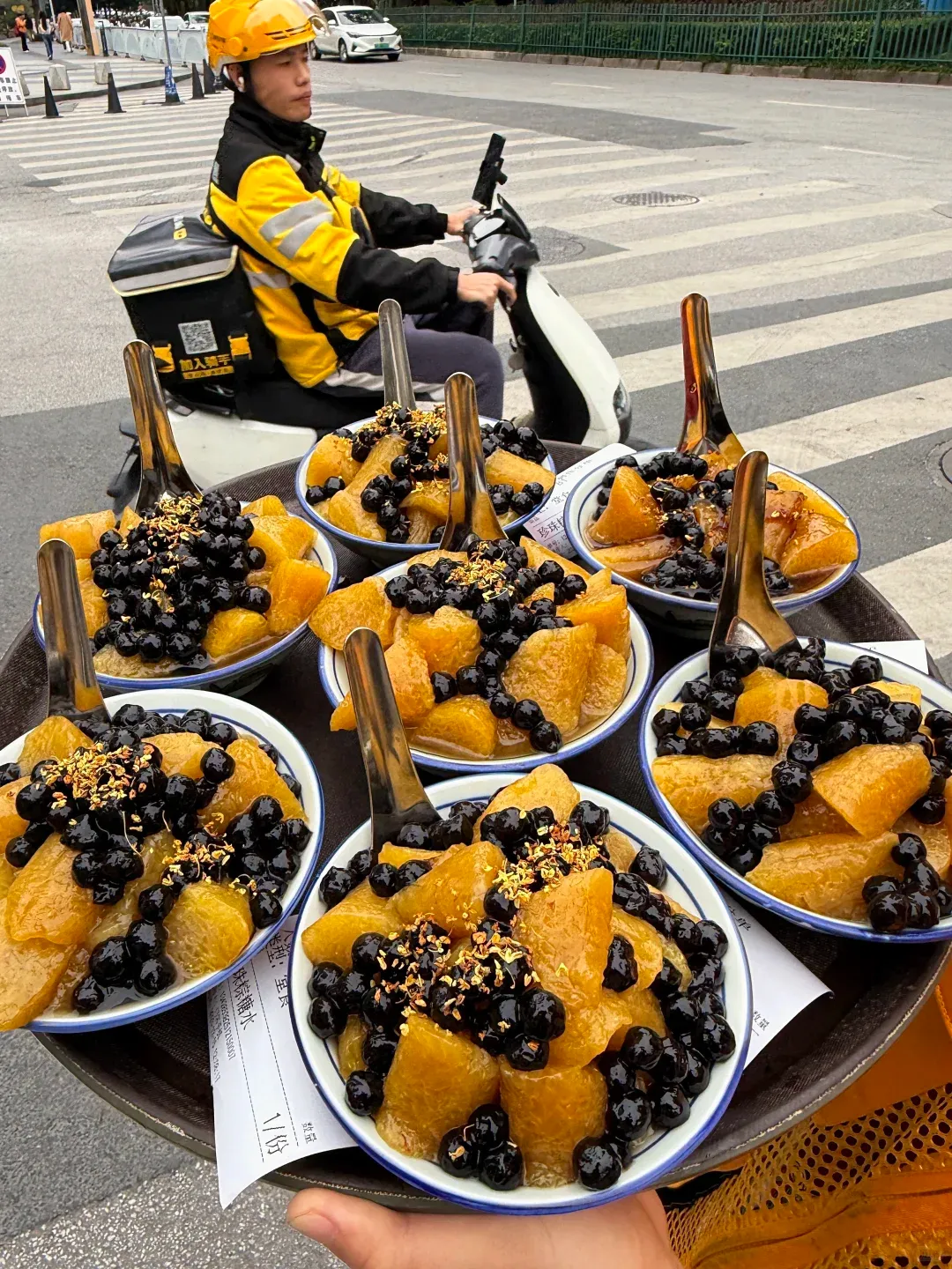它的外观真的太诱人了,碗里堆满了像琥珀一样金黄剔透的“果冻块”,色泽润亮。上面铺了满满一层黑珍珠,还细细地撒了些干桂花点缀,看着就颇具艺术感。吃起来的口感软糯Q弹,带着一股独特的植物清香和碱水味,配上冰凉清爽的糖水底,再嚼几颗有韧劲的珍珠,清爽不腻,简直是解暑神器!
