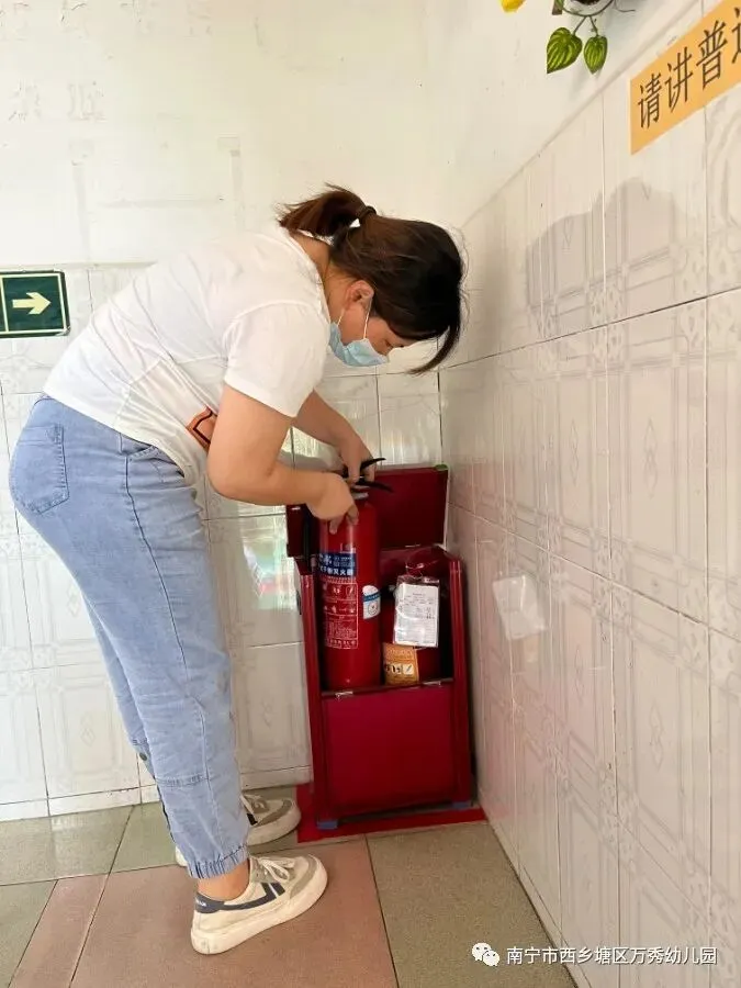 负责安全检查的老师对园内消防器械及户外器械进行安全隐患的排查。