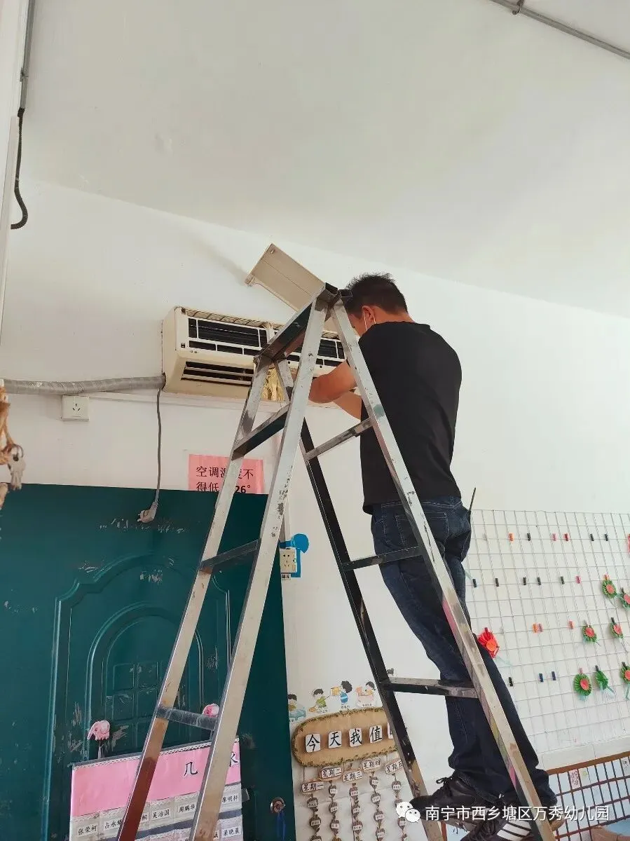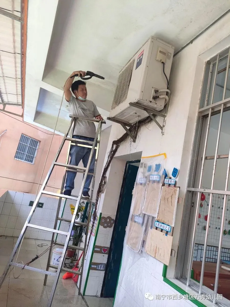 5月3日邀请专业的空调师傅对室内空调进行消毒清洗。