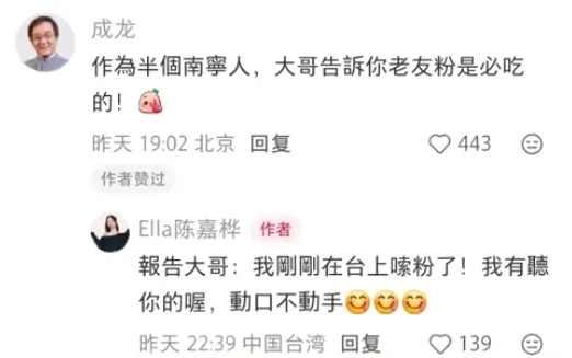 此后,成龙现身陈嘉桦账号评论区,称自己“作为半个南宁人,大哥告诉你老友粉是必吃的!”