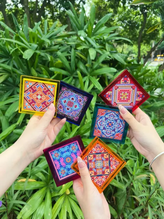 将广西壮绣与现代生活美学相融合,以精美刺绣纹样装饰布艺杯垫,背面巧妙嵌入磁石,使其可随心吸附于冰箱等金属表面,化身为一道独特的文化风景。它既是实用的生活小物,亦是可移动的壮族艺术展品,让非遗技艺以更轻盈、亲切的方式融入日常,传递指尖上的民族智慧与文化温度。