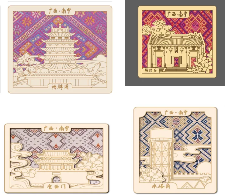 这套三街两巷主题地标壮锦冰箱贴系列,主要涵盖畅游阁、城隍庙、仓西门、水塔角等地标,共同织就南宁的鲜活记忆。