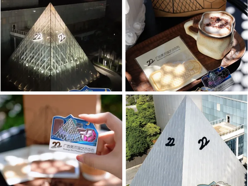 产品以广西美术馆22号艺术中心独特的建筑美学为核心灵感,提取其标志性的三角体结构、线条韵律与空间节奏,融合光影与艺术的美感,将建筑转化为可触碰、可品尝的生活化艺术品,让美术馆的建筑魅力跳出空间限制,融入日常场景。产品包含透光冰箱贴、几何小饼干、建筑造型拉花咖啡及咖啡外带包装,通过“视觉—味觉—触觉”的多维体验,打破艺术与生活的界限,让艺术不止在展馆内,更在美好生活的瞬间。