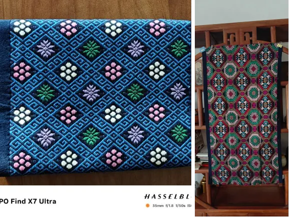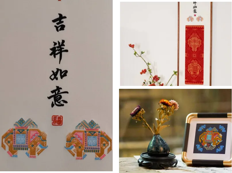 产品创新融合广西壮锦与刺绣工艺,以壮锦经典的吉祥纹为织锦基底,叠加精细刺绣工艺,纹理层次丰富,尽显文化厚重感。设计巧妙将“吉祥如意”寓意具象化——借“吉象”谐音诠释“吉祥”,以吉象纹呼应“吉象如意”,让美好祝愿融入工艺细节。