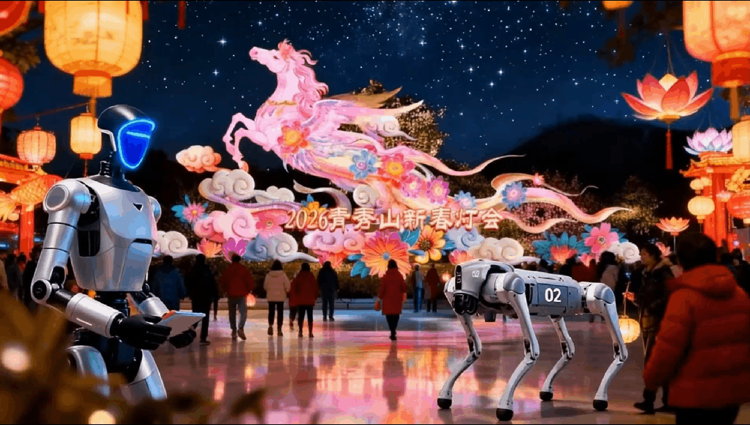本届灯会还突破传统,首创“非遗火艺”与“AI科技”两大王牌矩阵交织演绎。从大年初一至初八,700架无人机夜空梦幻编队,勾勒吉祥画卷;智能机器人、机器狗多场地灵动巡游,与游客趣味互动,零距离体验科技魅力。