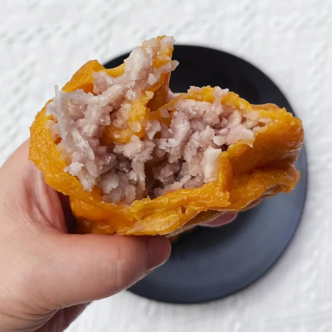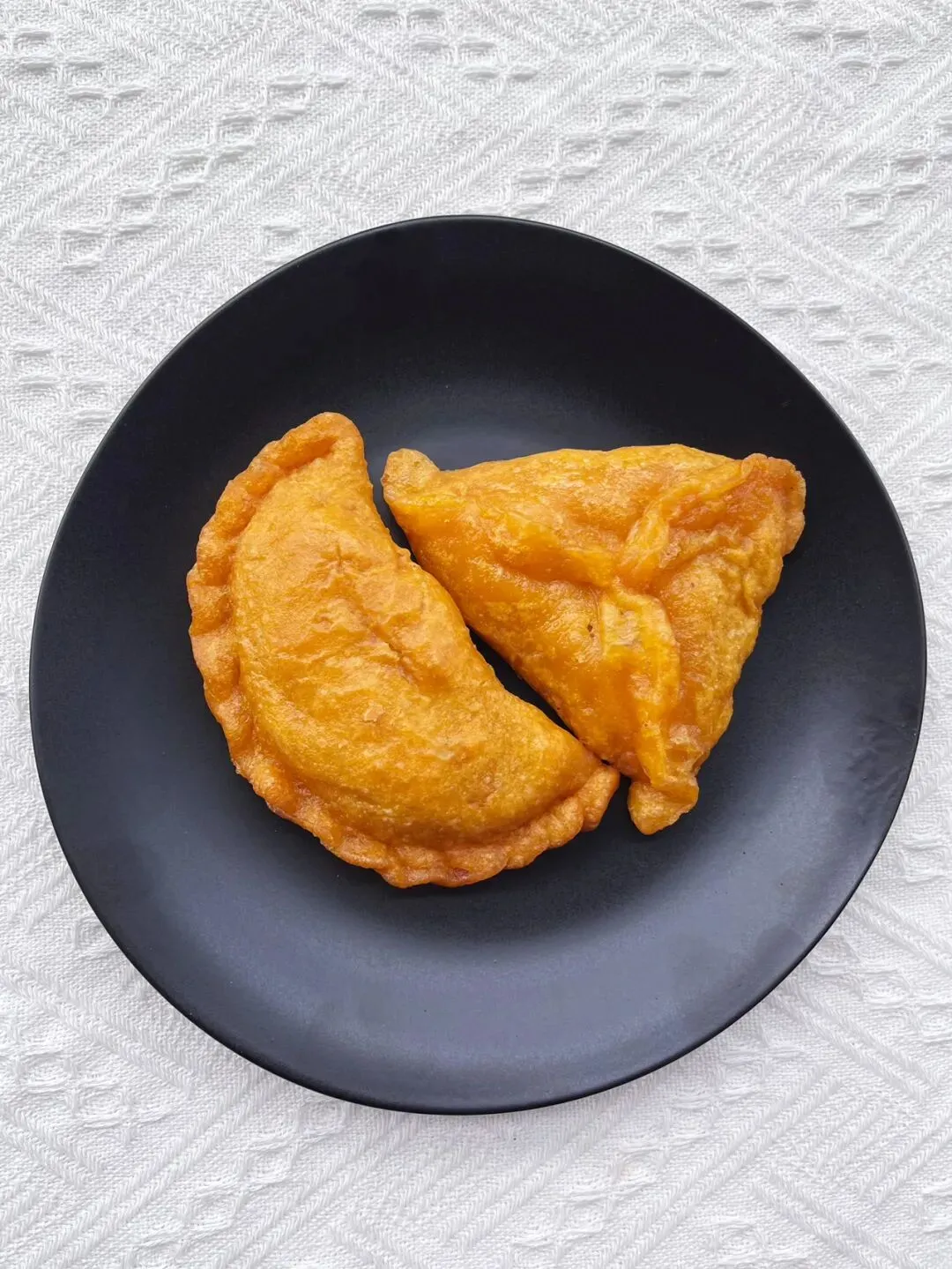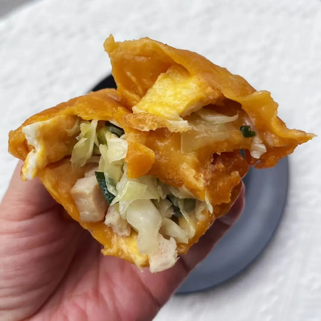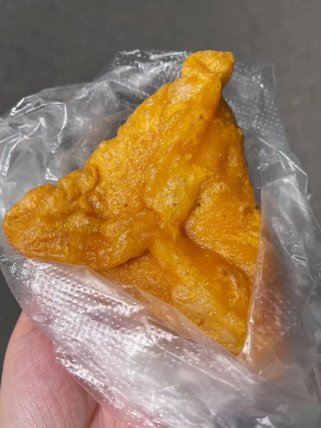 另一种三角形,有点像回旋镖,又有点儿像粉饺,要不是皮比较厚,还以为是炸粉饺。两个都有些像蛋饺,但是又比蛋饺要偏金黄一些。