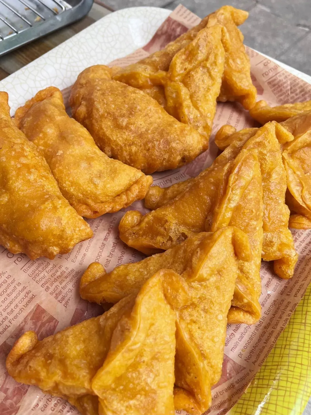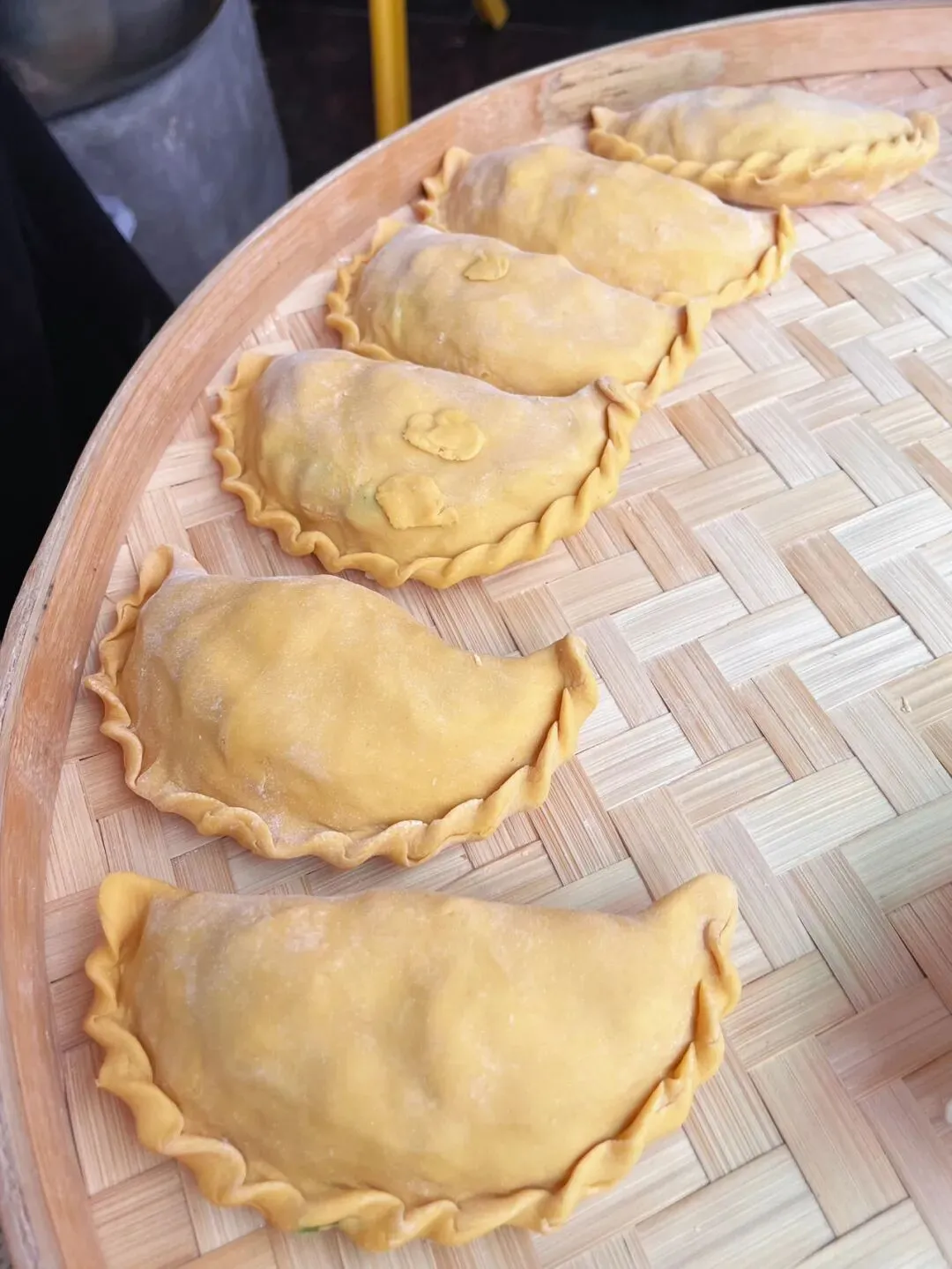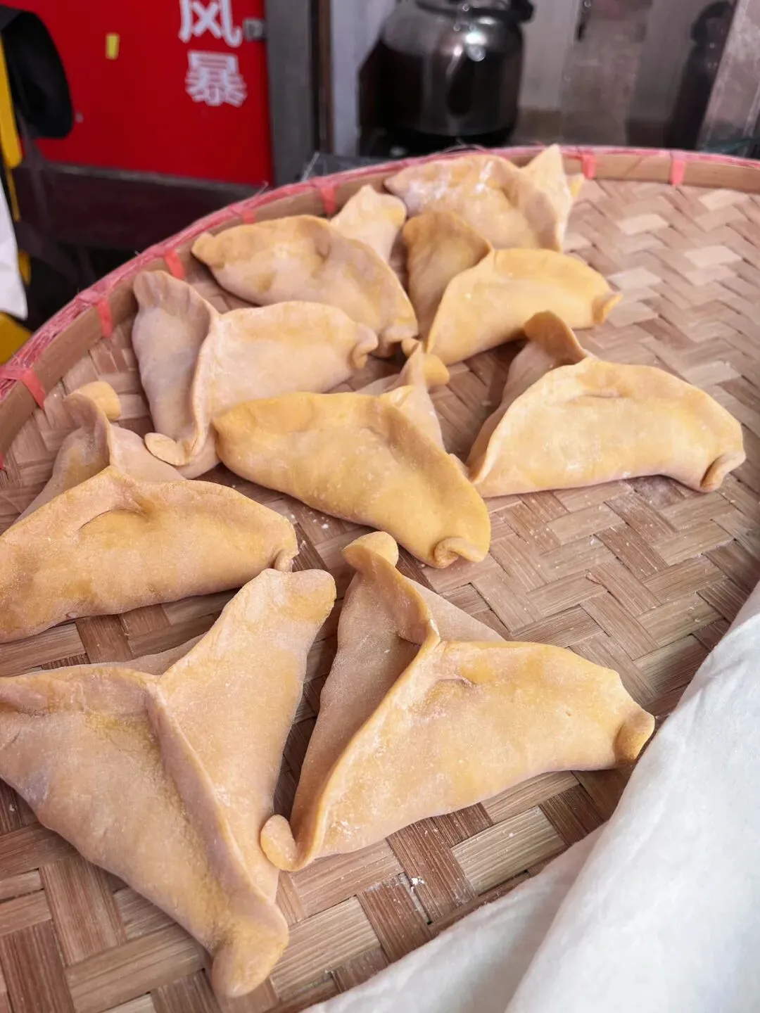 他们家主要是包这两种小吃,一种像月牙饺子一样,但是比饺子大个很多,弯弯的,肚子饱满,乍眼一看,还以为是煎黄的饺子,可煎饺又没有这么金黄。