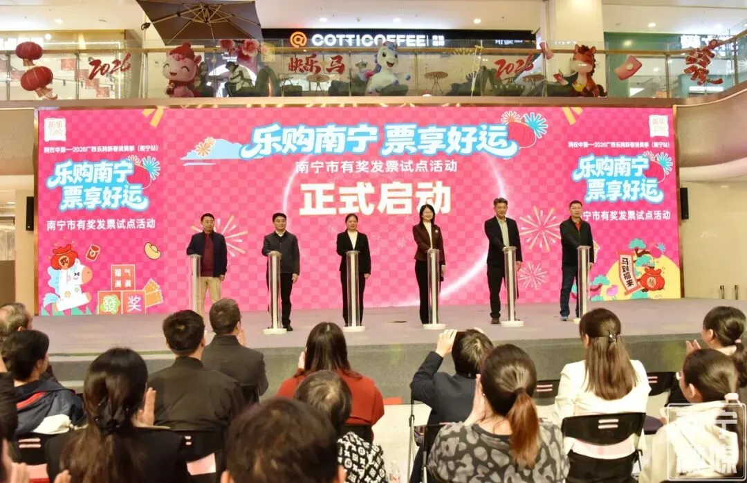 春风暖邕城,惠民添新喜。2月7日下午,华丰·爱琴海城市广场内暖意融融,“乐购南宁·票享好运”南宁市有奖发票试点活动启动仪式在此举行,标志着南宁跻身全国首批50个有奖发票试点城市后,这项惠民促消费举措正式落地。作为购在中国——2026广西乐购新春消费季(南宁站)的重磅内容,活动将从2月7日持续至7月26日,一张数电发票最高可赢800元奖金,为市民日常消费送上实实在在的福利,点燃邕城新春消费热情。