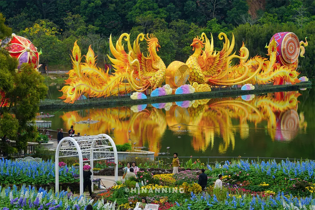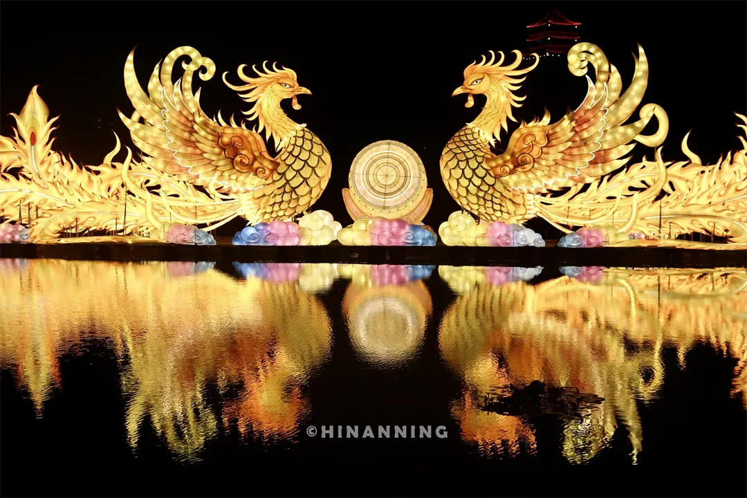“双凤和鸣”灯组,双凤华美的造型,再加上壮乡绣球和鼓乐元素,民族欢腾的气韵直接拉满。