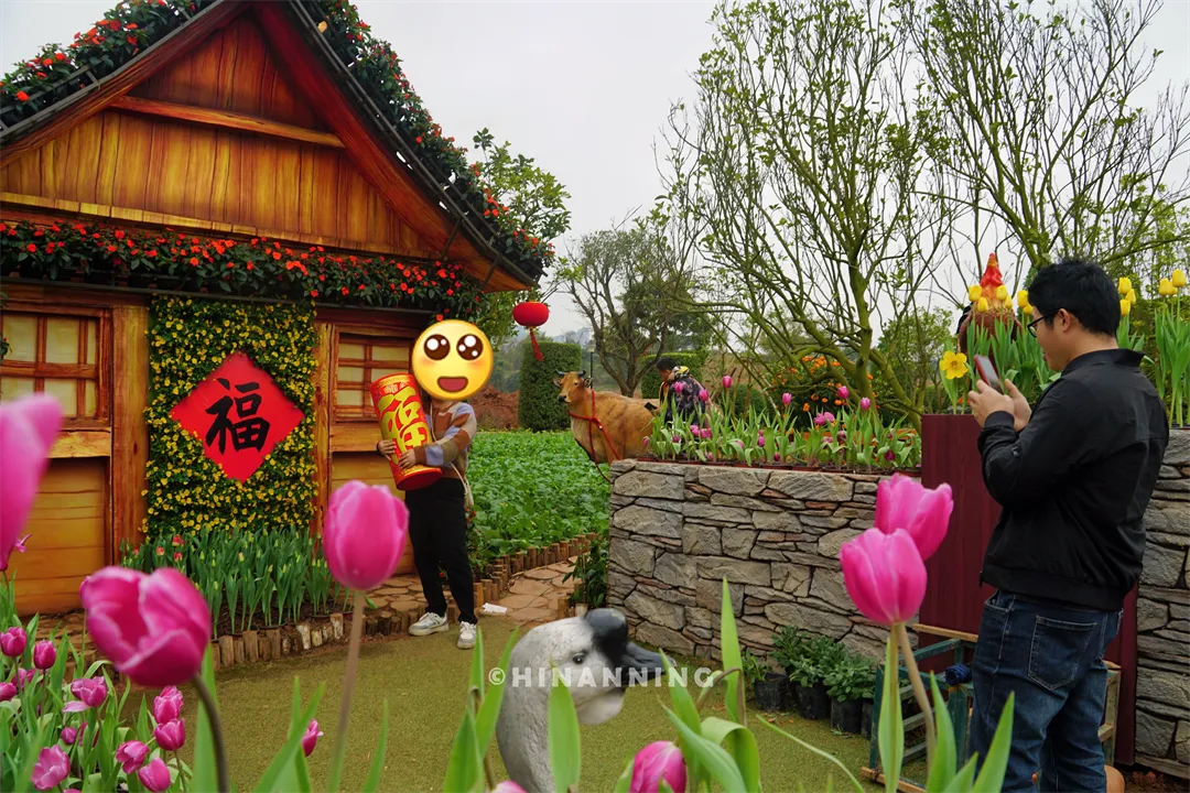 花田旁的农家小院田园气息十足,有房有田还有花,景区还在这里放置了几个福字道具,供游客拍摄时使用。大家现在要做的,就是想好pose。