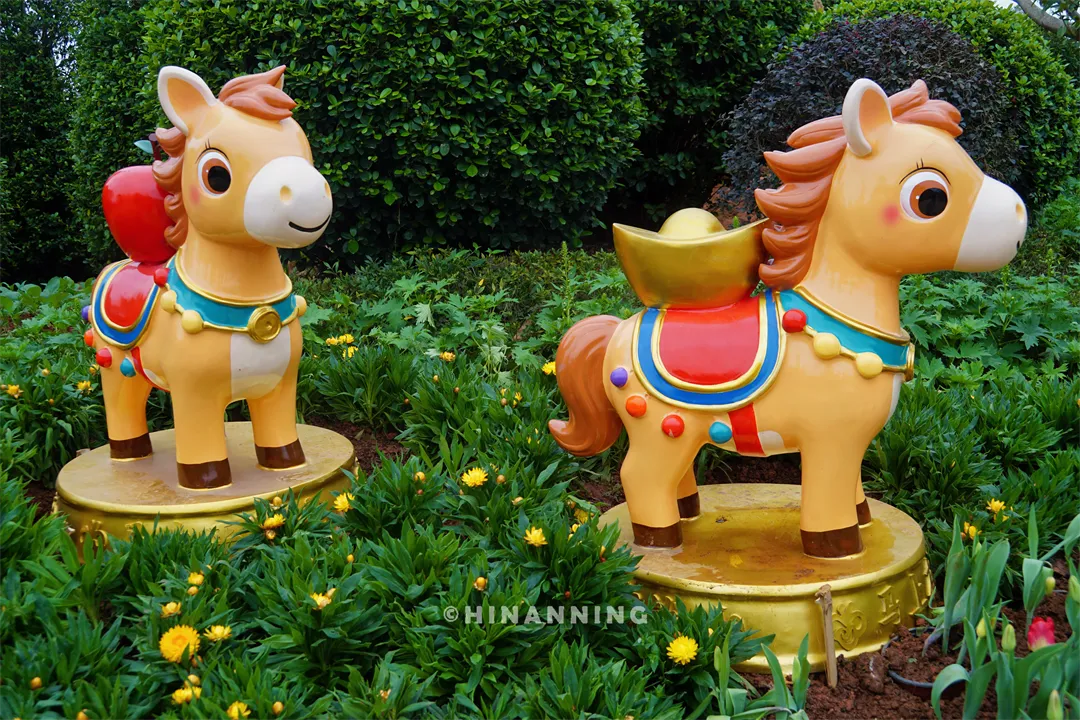 活动现场展出了《迎春纳福》《财源广进》《马到成功》《红火兴旺》《瑞气盈门》《花迎岁暖》等多组热闹喜庆、寓意吉祥的园林小品,再搭配上凤仙、杜鹃、百合等新春花卉,整个园区就像被春天施了魔法一样,百花齐放、春色满园。