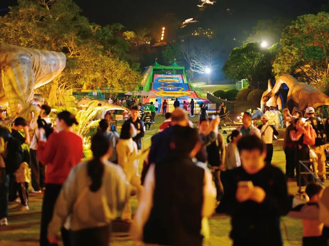 更让人惊喜的是,东区草坪上还搞了个规模宏大的恐龙场景,霸王龙高达15米,双龙争霸的场面,那叫一个震撼!等夜幕一降临,恐龙群就像“活”过来一样,带着友仔友女们穿越回侏罗纪时代,这视觉盛宴,谁看谁迷糊。
