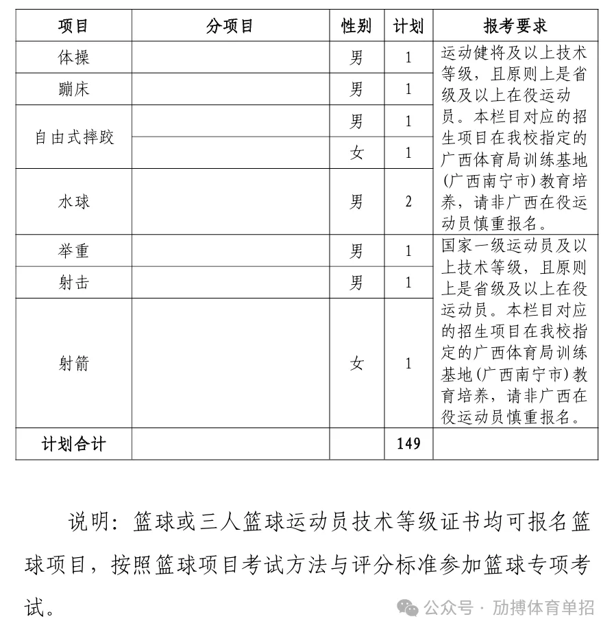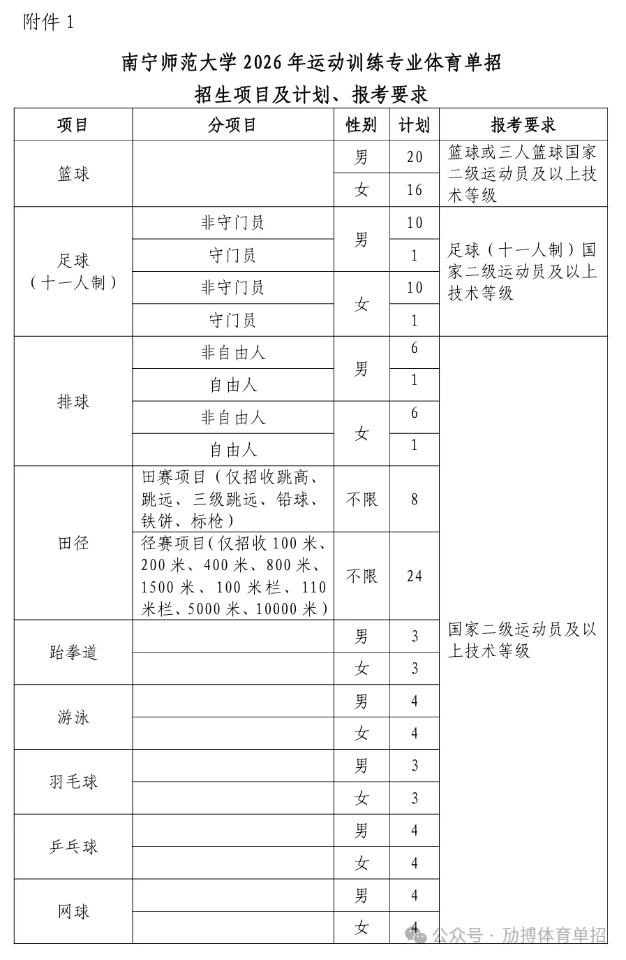 具体招生项目及计划、报考要求详见附件1《南宁师范大学2026年运动训练专业体育单招招生项目及计划、报考要求》。