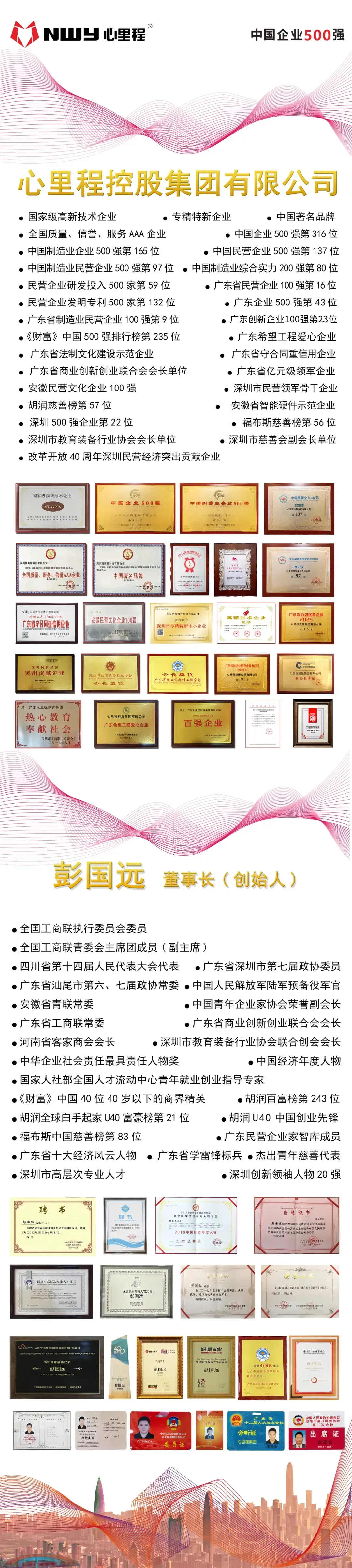 心里程控股集团有限公司,由创始人彭国远董事长于2007年创立,集团组建于2013年,总部位于深圳市,是由国有企业参股,民营企业控股并运营管理的混合所有制的企业集团,是国家级高新技术企业、专精特新企业,是中国教育技术协会副会长单位、广东省商业创新创业联合会会长单位(广东省委统战部、省工商联直属商会)、深圳市教育装备行业协会会长单位。先后荣登中国企业500强第316位、中国民营企业500强第137位、中国制造业综合实力200强第80位、中国民营企业研发投入500家第59位、中国民营企业发明专利500家第132位、《财富》中国500强第235位等荣誉榜单。集团下设六大省级子集团公司,拥有布局海内外超50家控股参股公司。主营业务涉及教育数字化、高端精密智能制造、智慧科技幼儿园、投资、置业等多个领域。自主研发的AI智慧教育整体解决方案连续多年参展中国教育装备展示会和深圳教育装备博览会,广受关注和赞誉,相关产品、方案覆盖全国十多个省、市,为6000多所学校,1000多万师生提供服务,获得教育主管部门与师生的一致好评。近年来,在广东、北京、重庆、四川、江苏、湖南、湖北、安徽、贵州、福建、河北、甘肃、云南、山东、海南、吉林等二十多个省市县(区)投资兴业,累计投资超过百亿元。同时,积极响应国家号召,在四川、湖南、湖北、海南、云南、江苏、河北、贵州、吉林等地践行国企民企混合所有制改革,与政府国资共同成立合资公司,或入股国资公司,或政府国资公司参股心里程教育集团,充分发挥国企民企各自优势,更好的服务国家社会和经济高质量发展。① 广东心里程教育集团股份有限公司(专注教育装备生产研发的企业集团);② 广东心里程产业投资集团有限公司(专注国内与政府合作的投资企业集团);③ 广东心里程置业集团有限公司(专注资产与置业的企业集团);④ 广东心里程教育投资集团有限公司(专注学前教育领域投资及管理的企业集团);⑤ 四川渠心科技集团有限公司(与四川国资混改的中国民营企业500强,专注于高端精密智能制造的企业集团);⑥ 中国智慧产业集团有限公司(专注海内外教育智慧产业的收购与并购的企业集团)。发展壮大企业的同时,不忘企业公民的社会责任,心里程始终秉持“一切从心开始”的经营理念,关注青少年的教育、成长与创业,积极开展慈善事业、乡村振兴、志愿服务关爱行动等,为实现全体人民的共同富裕贡献企业力量。近年来累计向社会捐资超三亿元,并多次登榜胡润慈善榜、福布斯中国慈善榜百强。